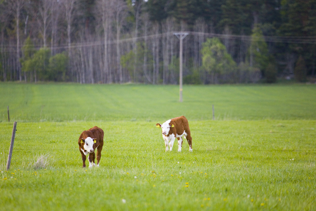 Två kalvar på grönbete. På detta foto kan associeras till: ko, kalv, kalvar, bete, hage.