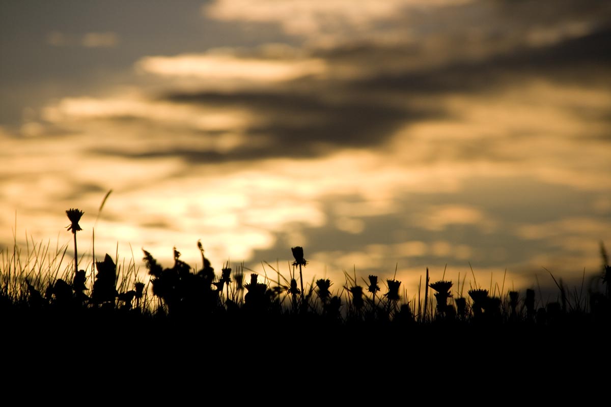En siluett av ängsmark. På detta foto kan associeras till: äng, ängsmark, siluett, solnedgång, moln.