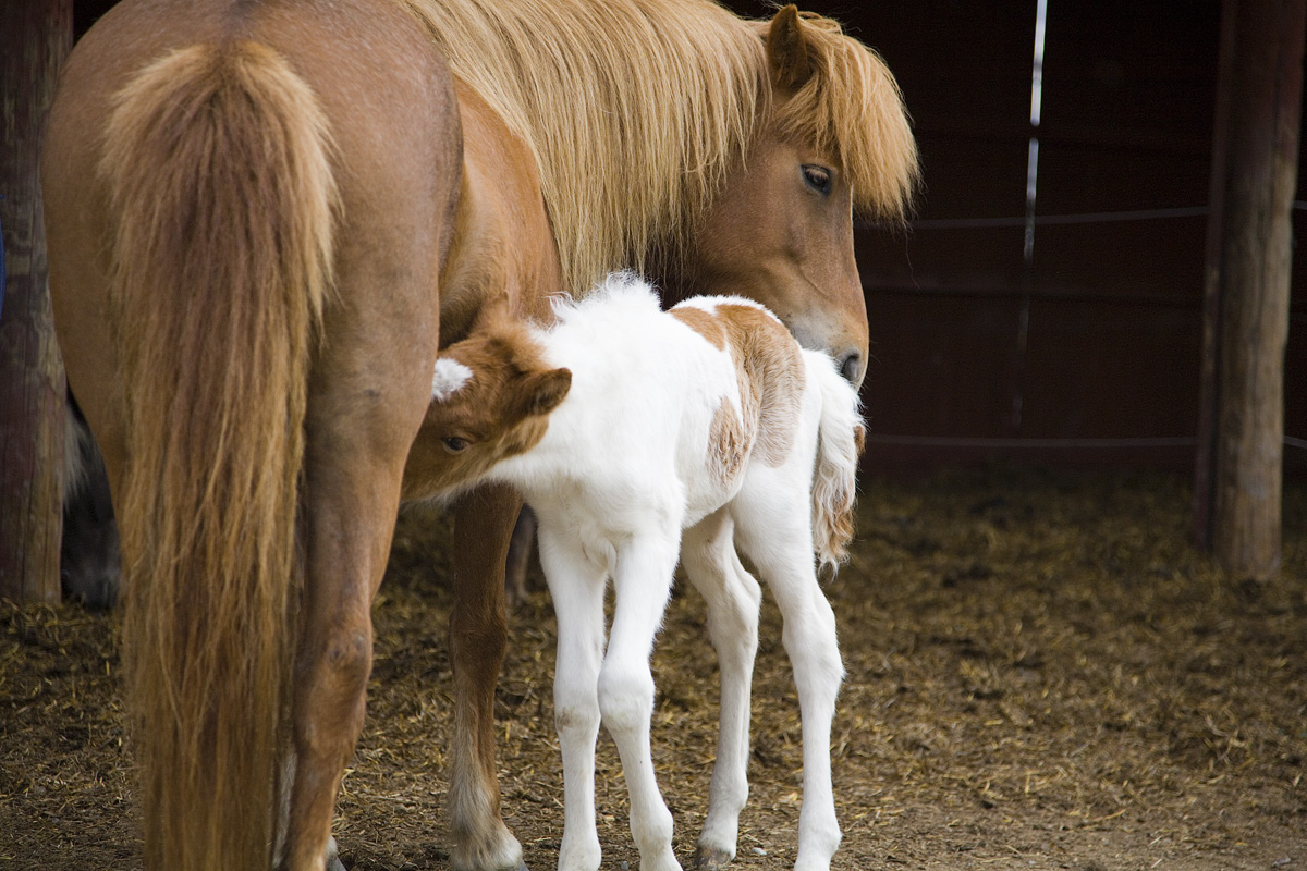 Ett sto med sitt föl. På detta foto kan associeras till: islandshästar, häst, stall, föl, sto.