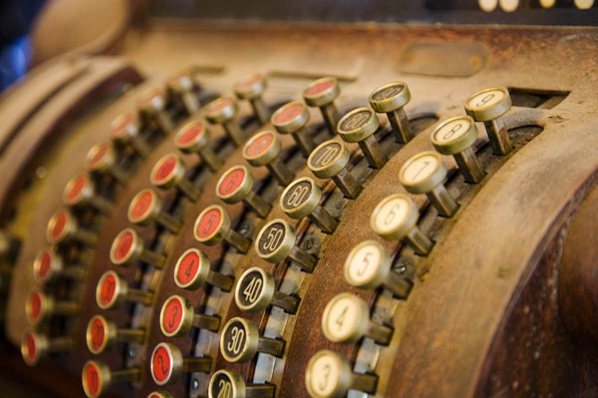 En gammal kassaapparat från början av 1900-talet. På detta foto kan associeras till: kassapparat, kassa, knappar, betala, affär.