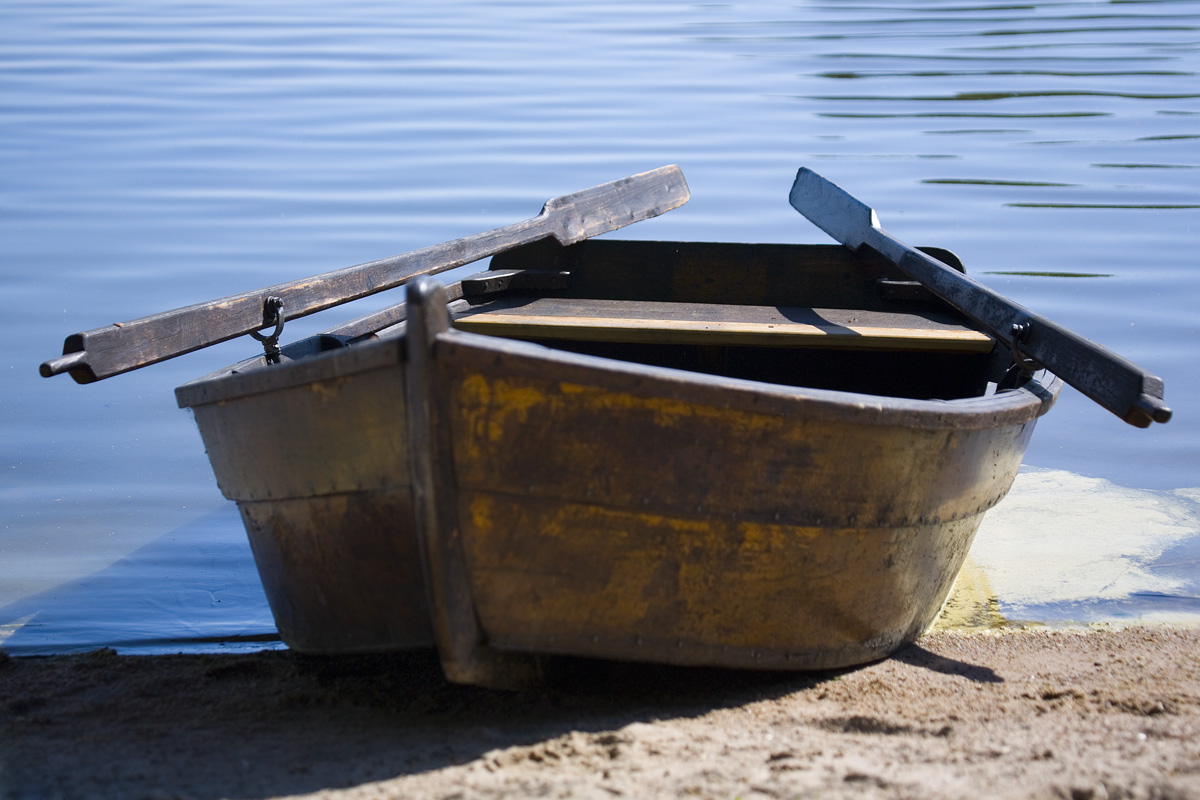 En eka vid strandkanten. På detta foto kan associeras till: eka, roddbåt, åror, träbåt, träeka, vatten, strand.