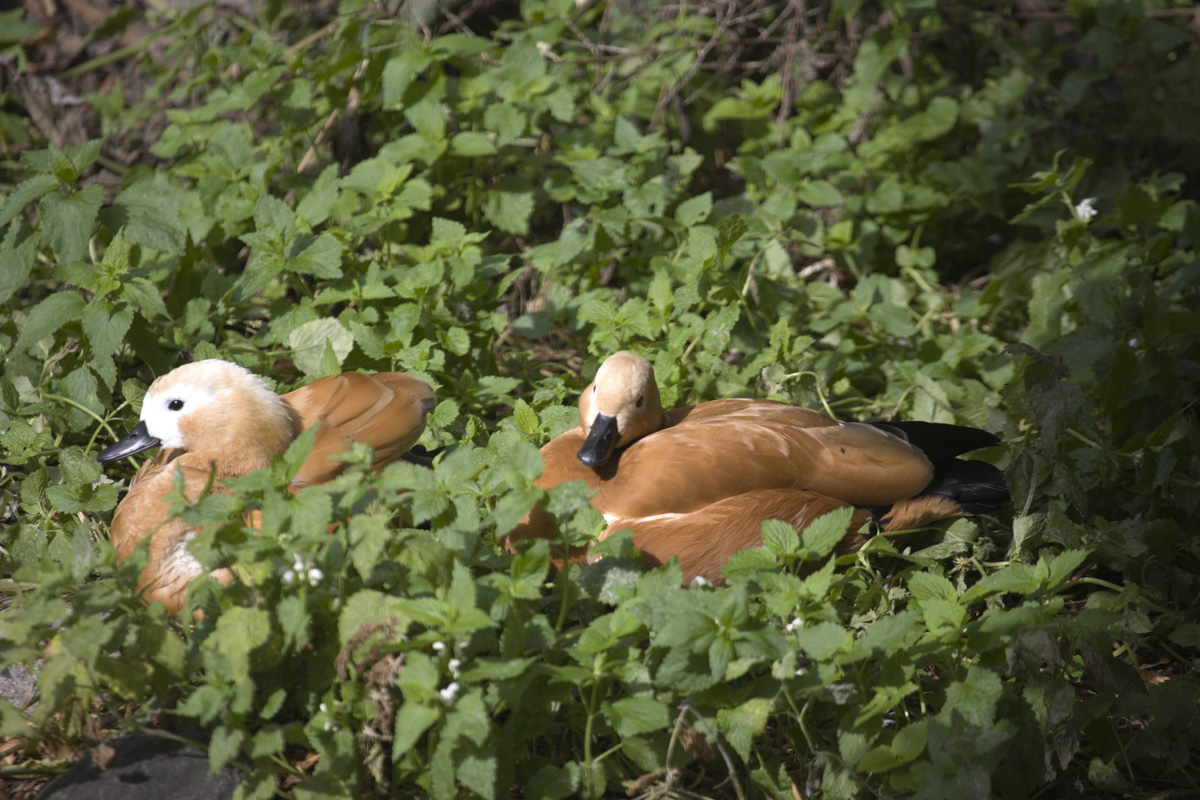 Två roständer ligger i det gröna. På detta foto kan associeras till: rostand, roständer, and, änder, fåglar, orange.
