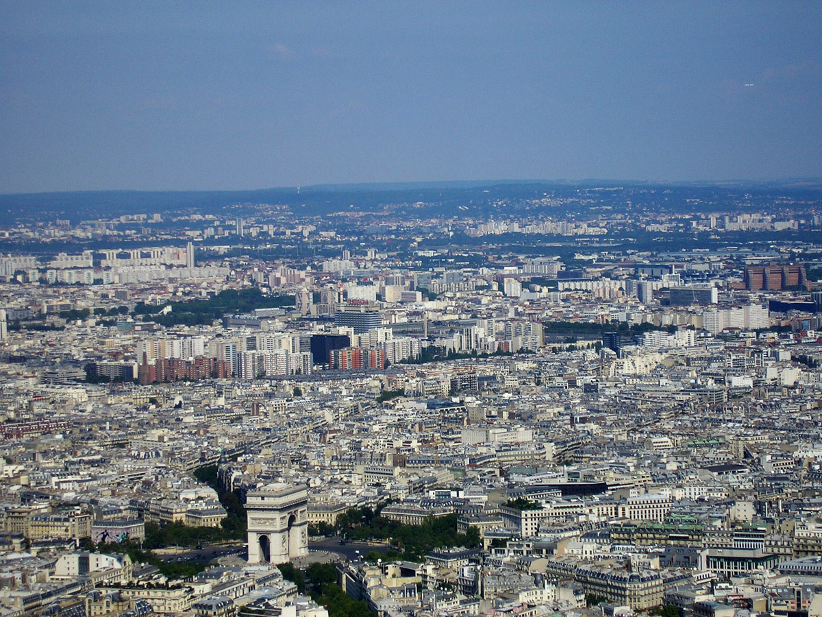 En vy över Paris tagen från Eiffeltornet, här syns bland annat Triumfbågen. På detta foto kan associeras till: paris, frankrike, eiffeltornet, byggnader, hus, stad, städer, triumfbågen.