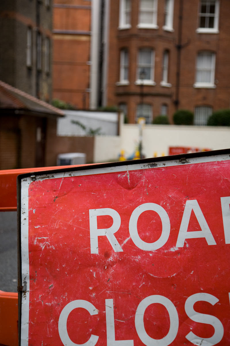 En skylt med texten Road closed, innebärande att vägen är avstängd.Sökord: englandlondonroadclosedavstängdavstängtväggata Storleken på denna bild är 800 x 1200 pixlar. Detta ger en bild på 7 x 10 cm med 300 dpi. Bildens id är 4014, anges vid beställning.