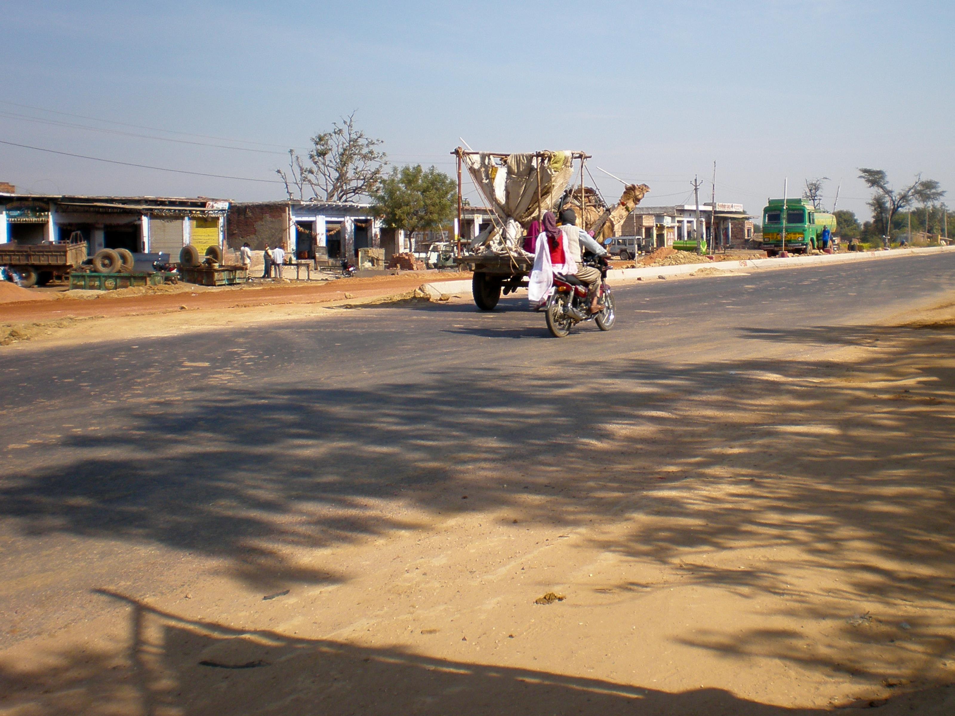 En väg i indien med både kameler och motorcyklar. På detta foto kan associeras till: indien, asien, kamel, mc, motorcyckel.