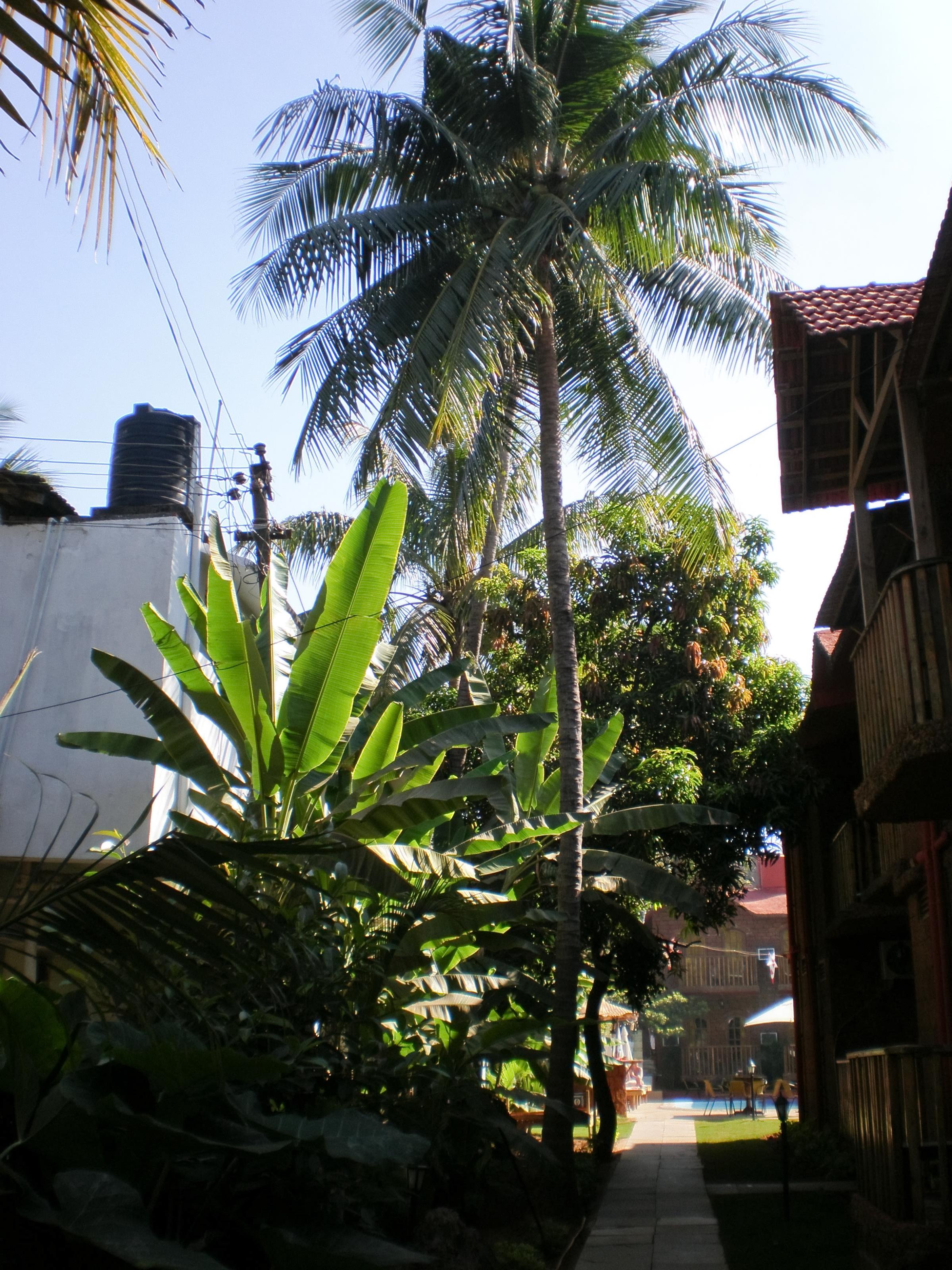 Byggnader och palmer, en bakgård någonstans i Indien. På detta foto kan associeras till: indien, asien, byggnader, träd, palmer, blad, grönt.
