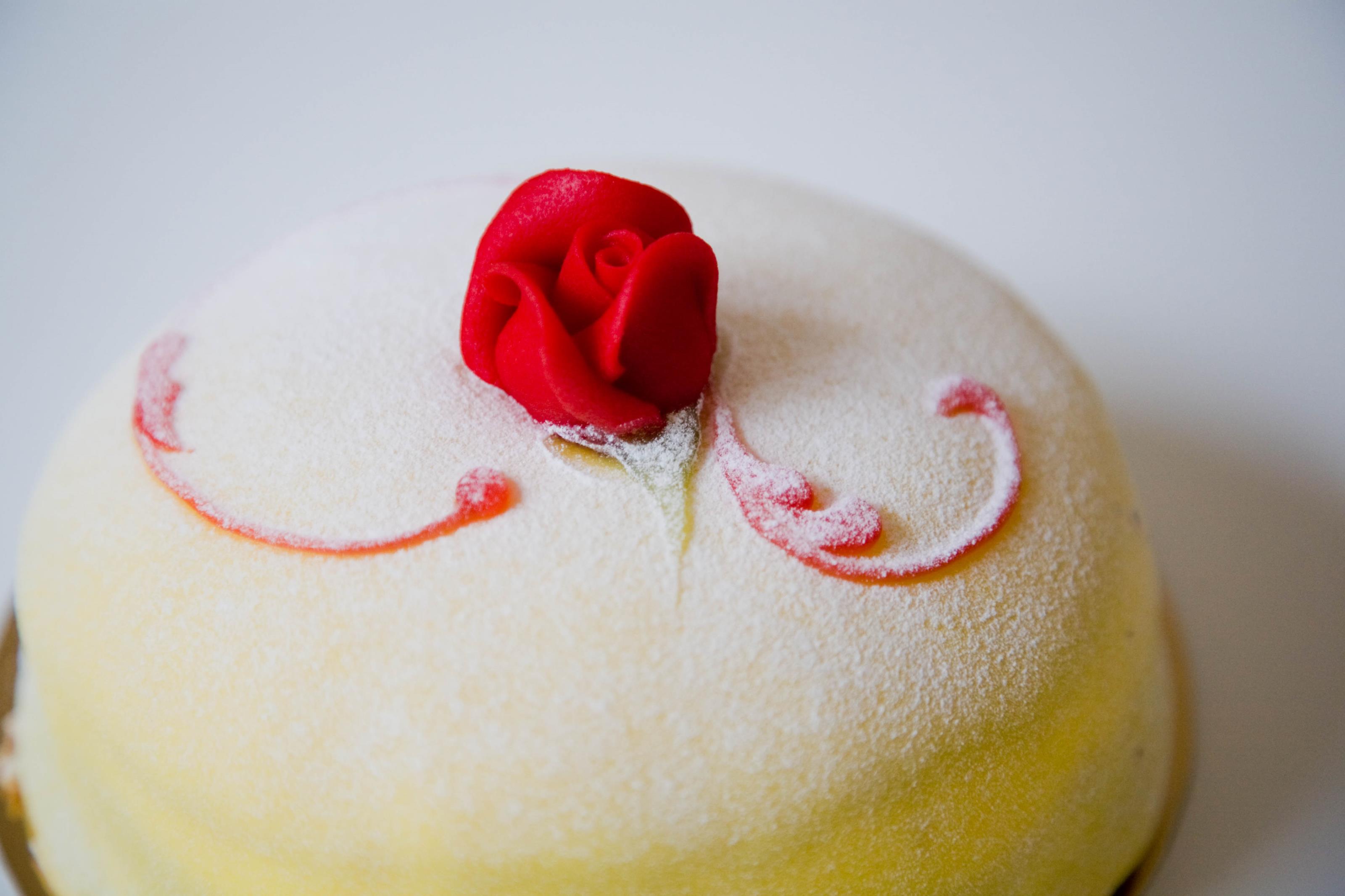 En gul marsipantårta med en röd ros på. På detta foto kan associeras till: tårta, kalas, fira, marsipan, ros, marsinpantårta, födelsedag.