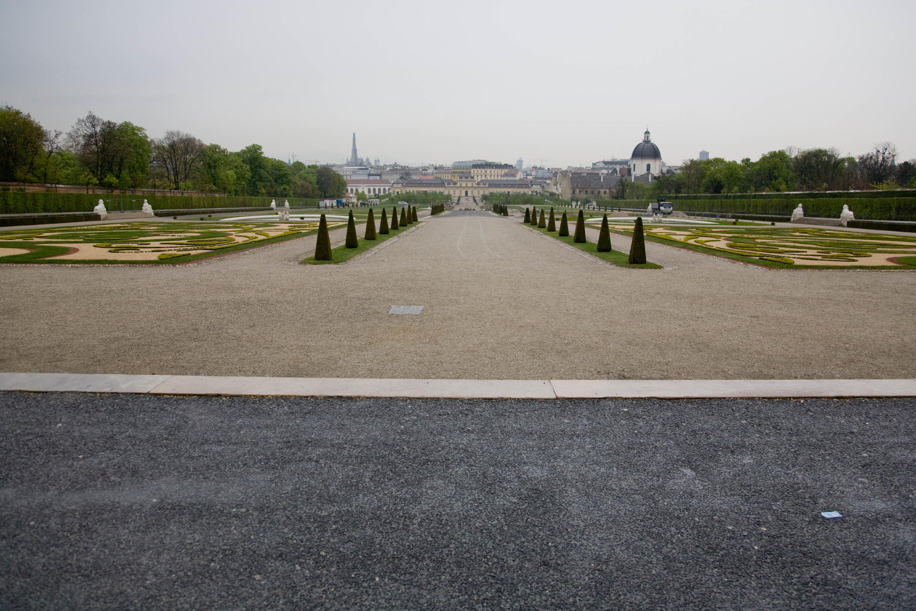 Utsikt över trädgården vid nedre Belvedere i Wien, Österrike. På detta foto kan associeras till: trädgård, slott, slottet, belvedere, överrike, wien, byggnader, växter.