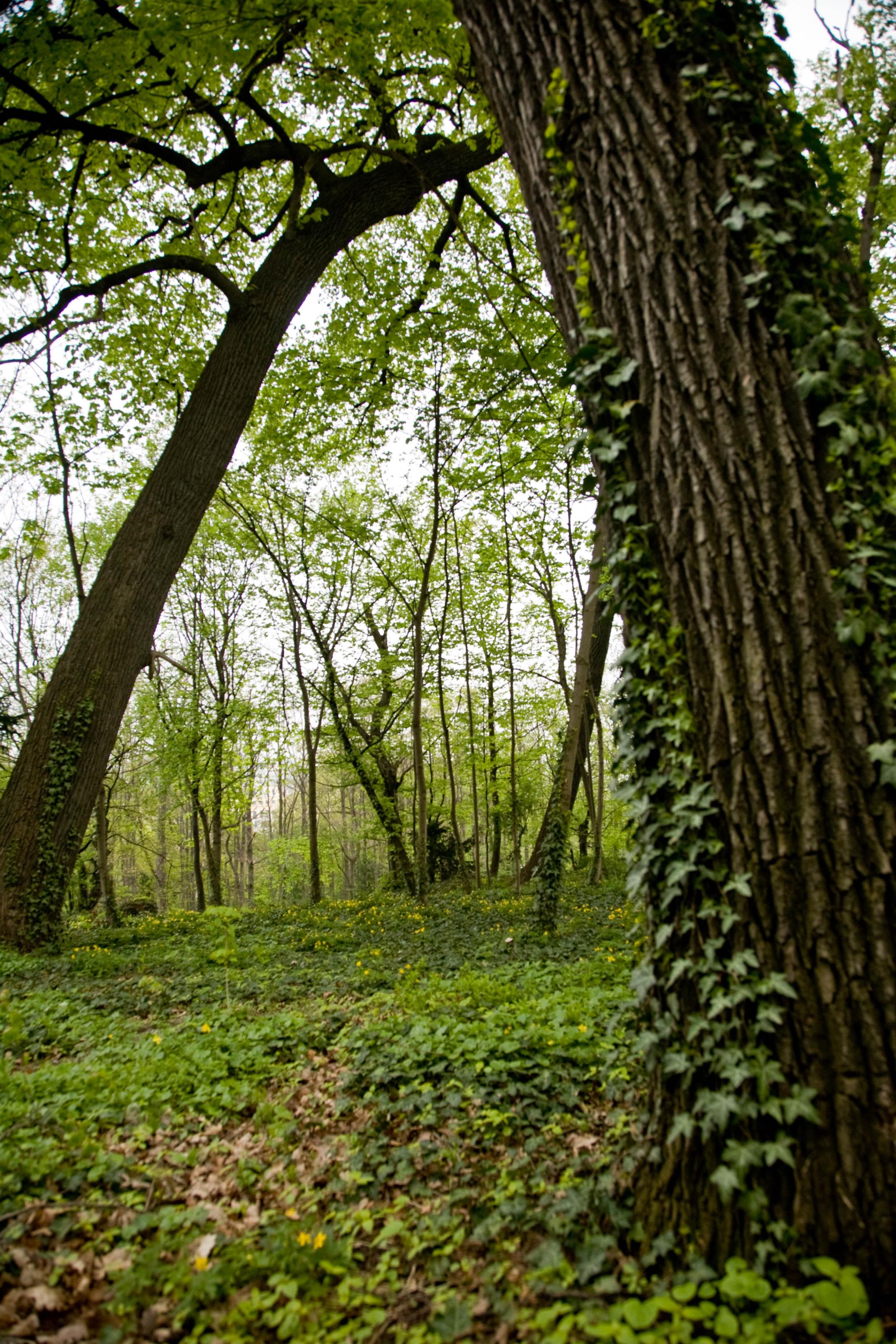 Stora sneda träd i skogen. På detta foto kan associeras till: wien, österrike, grön, träd, skog, växter, mugröna.