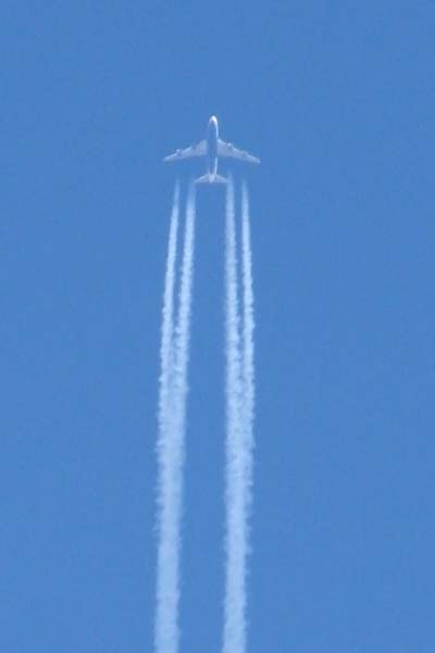 Flygplan flyger och släpper ut rök. På detta foto kan associeras till: fygplan, blått, himel, vit, rök.