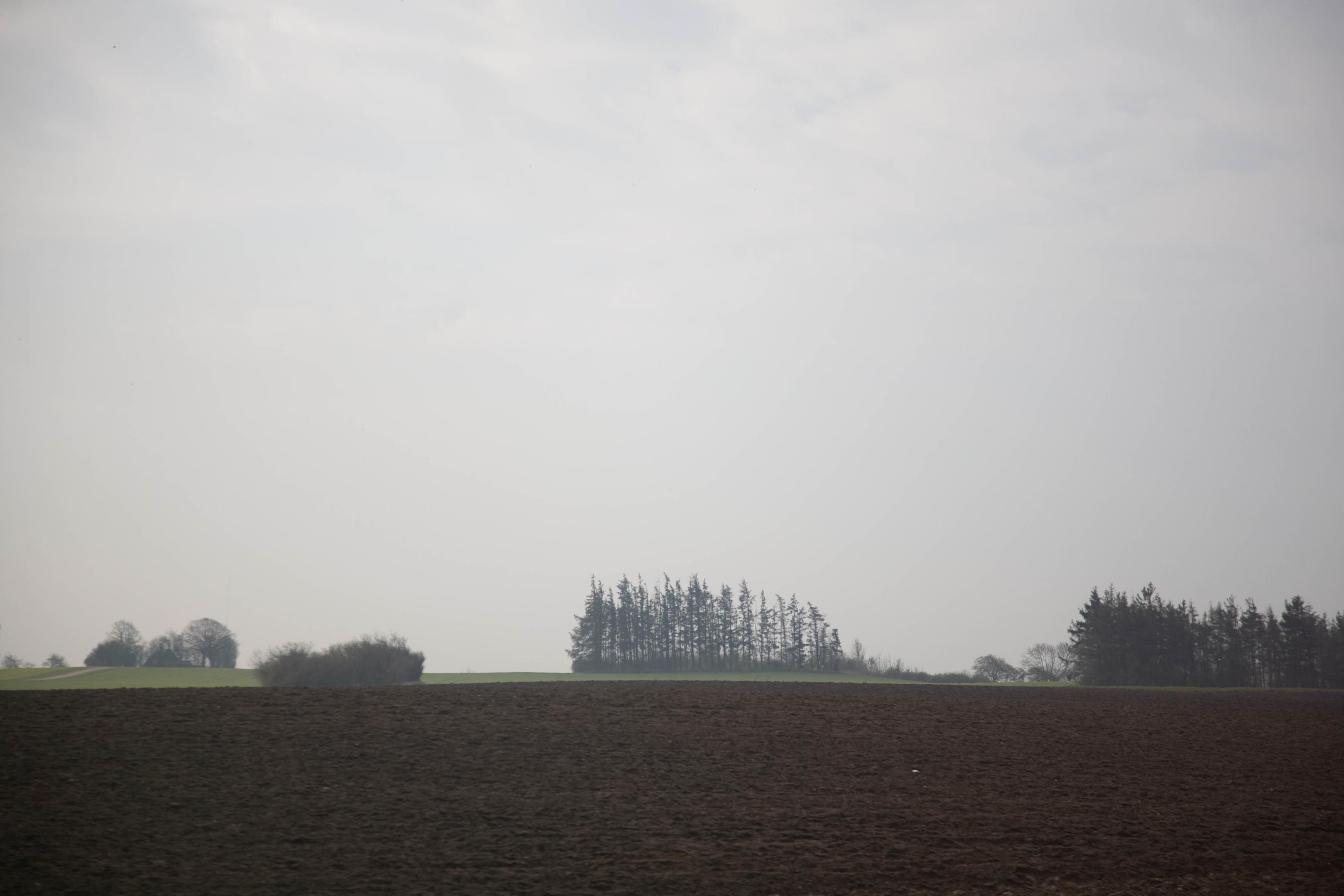 Danskt landskap. På detta foto kan associeras till: danmark, landskap, natur, åker, träd, mulet, moln.