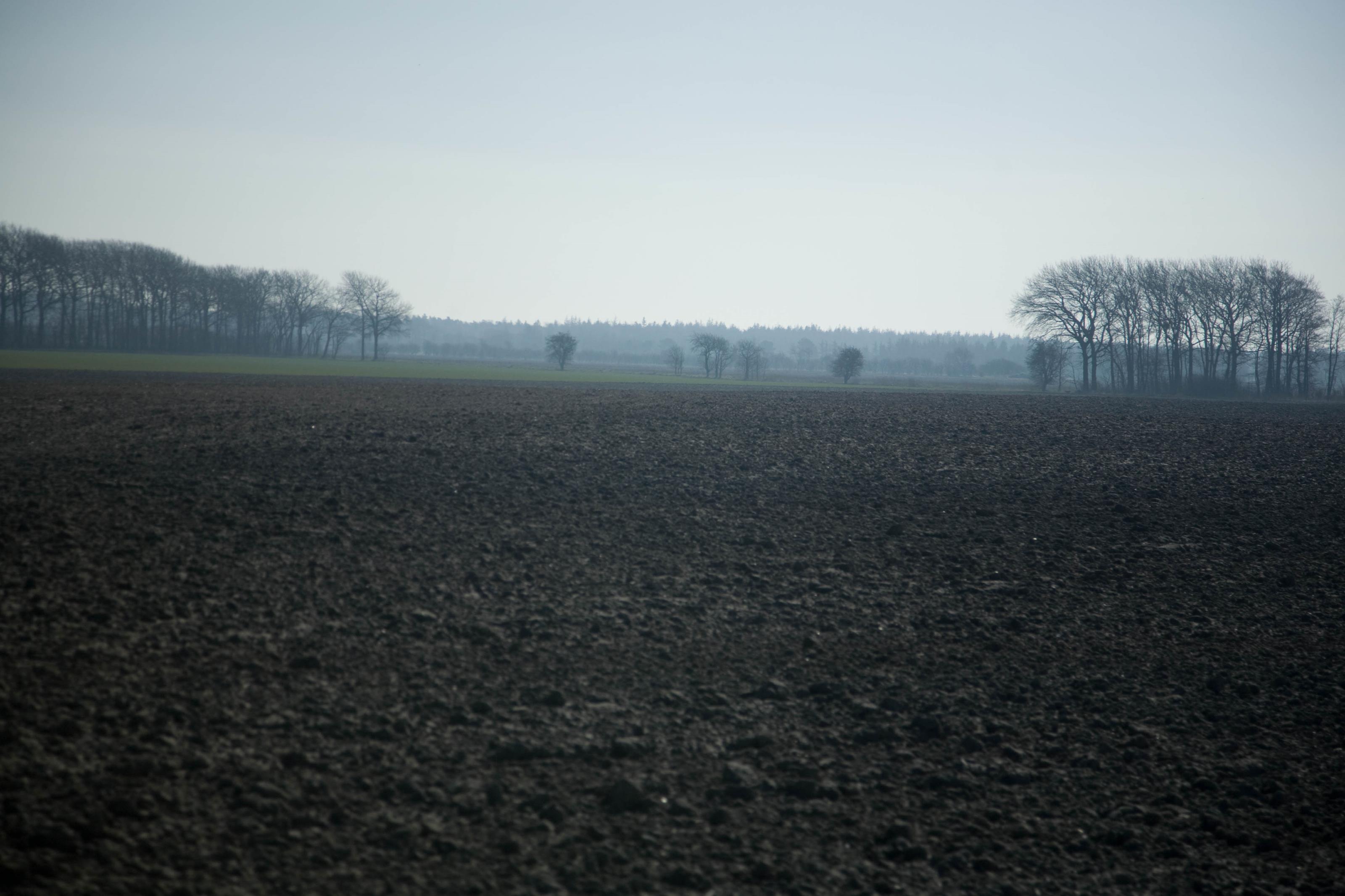 Stora åkermarker på Falster i östra Danmark. På detta foto kan associeras till: danmark, åker, åkermark, jord, så, träd, skog.