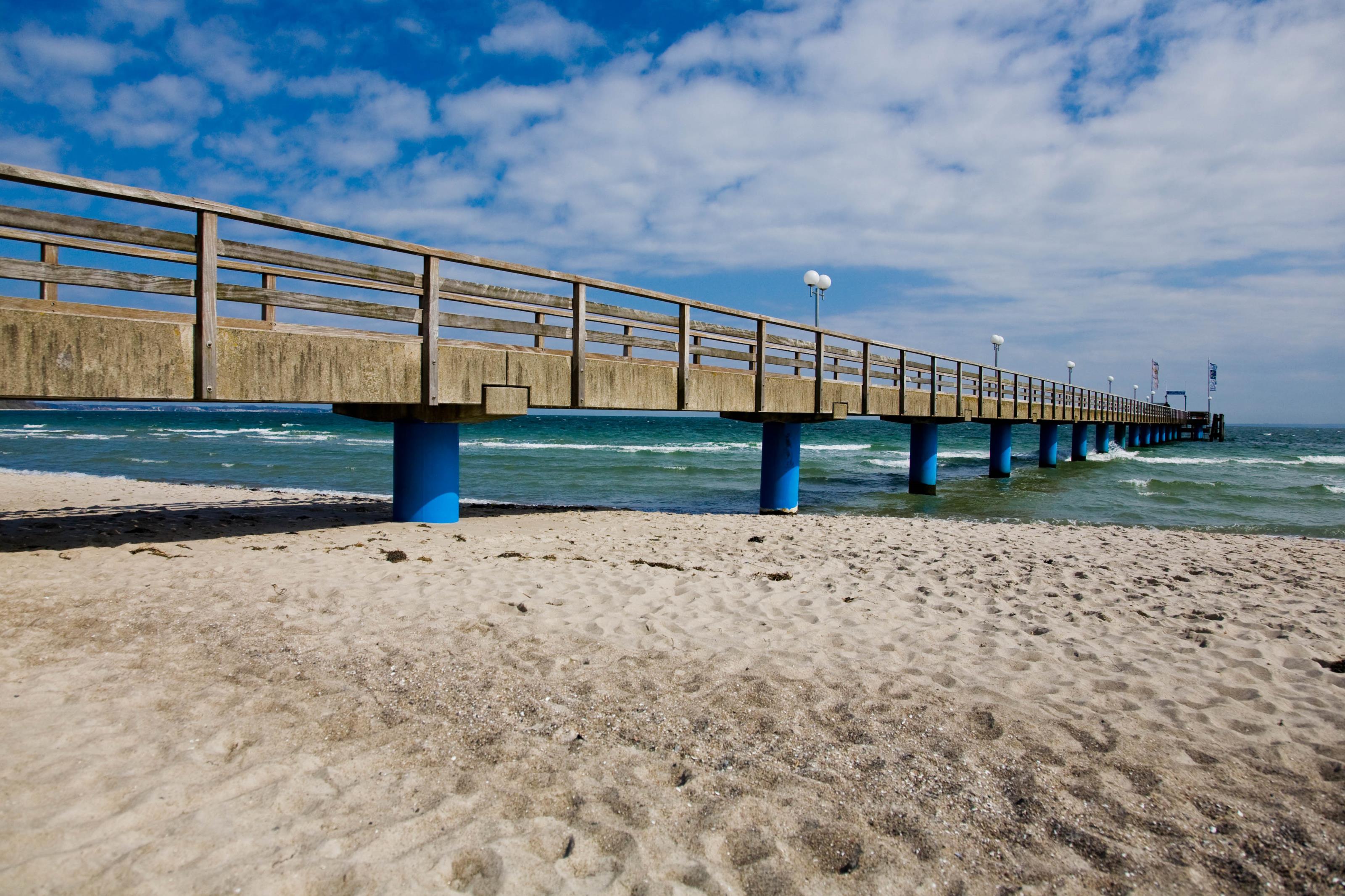 Bild från nordtyska staden Haffkrug. På detta foto kan associeras till: haffkrug, tyskland, brygga, landgång, hav, sjö, vatten, sand, strand, sandstrand.
