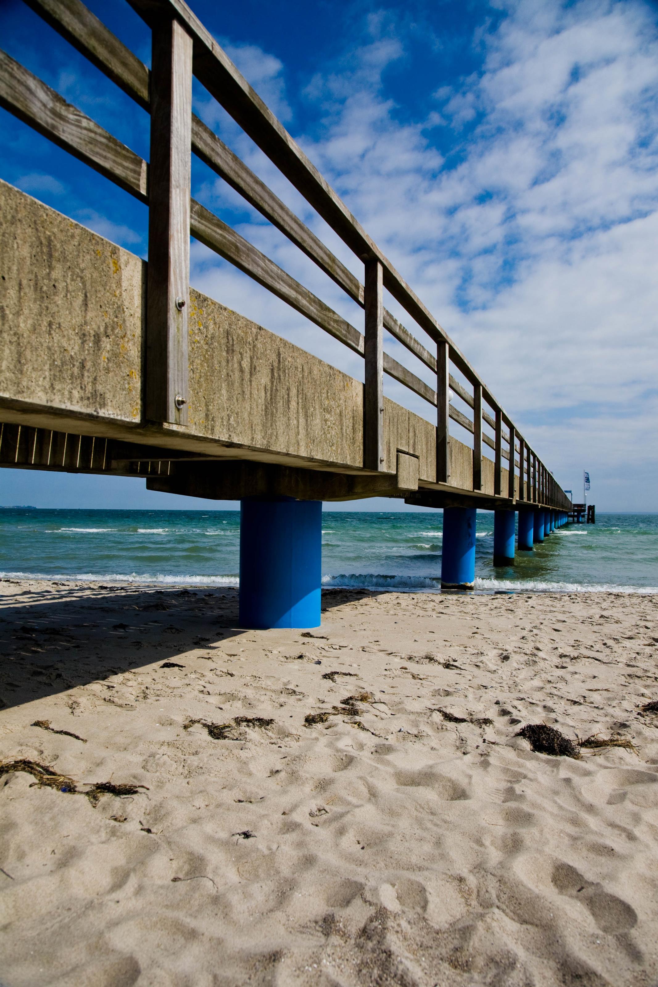 Bild från nordtyska staden Haffkrug. På detta foto kan associeras till: haffkrug, tyskland, brygga, landgång, hav, sjö, vatten, sand, strand, sandstrand.