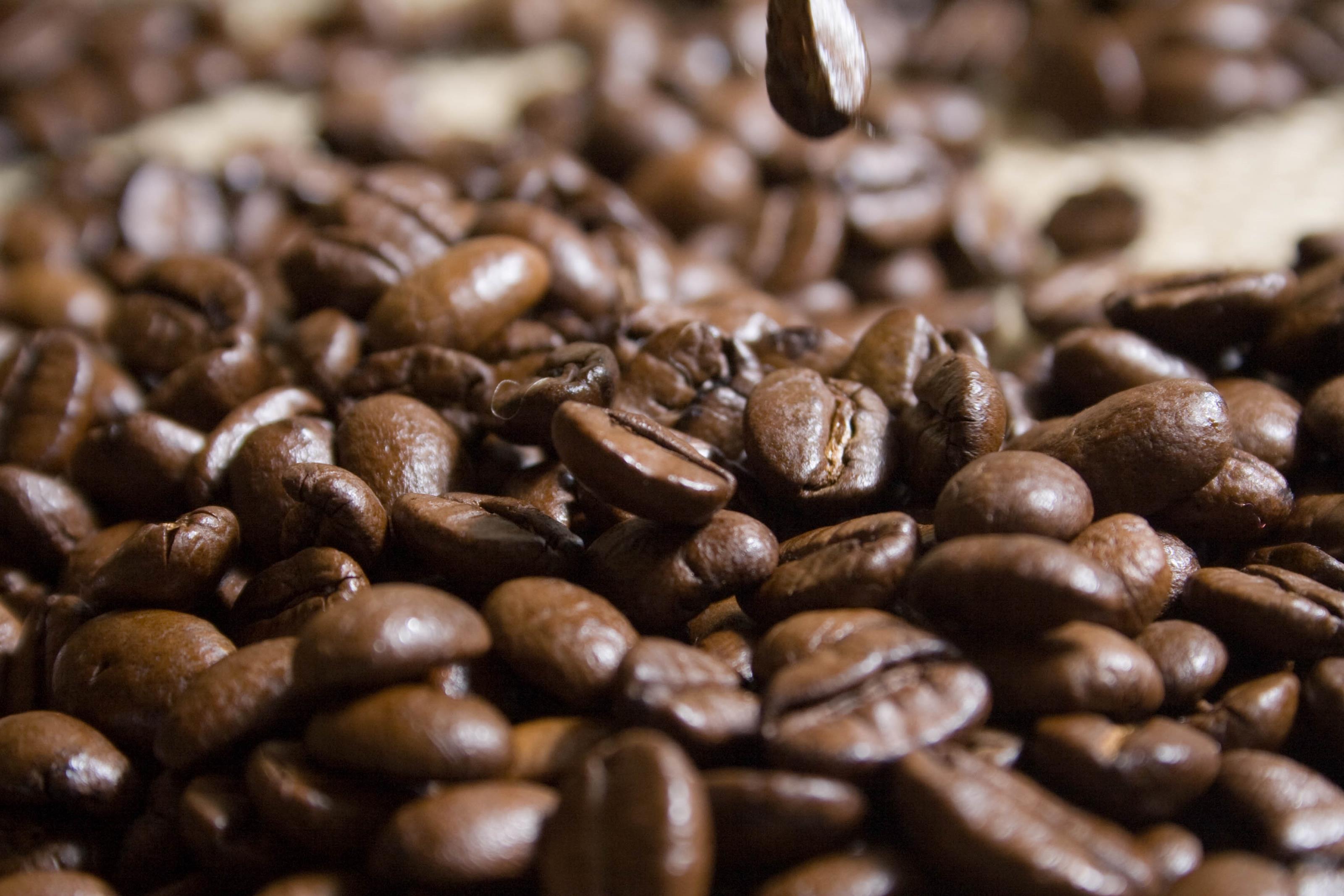 Rostade hela kaffebönor, grunden till en god kopp kaffe eller en kaffedrink. På detta foto kan associeras till: kaffe, bönor, kaffebönor, kaffeböna, rostad, rostade, brun, mörk, dryck, dricka, mocca, espresso, latte, arabica, koffein, bär.