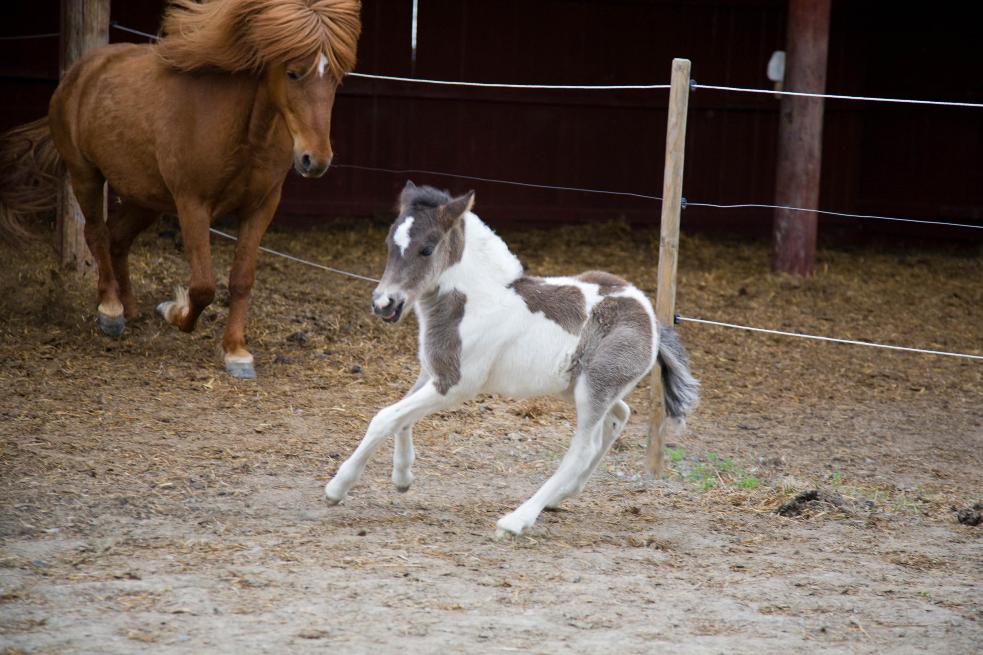 Lösgående hästar, inslandshästar vid ett stall. På detta foto kan associeras till: häst, hästar, inslandshästar, island, tölt, man, hovar, rida, ridsport, djur, däggdjur, riddjur, sport, ridskola, ridskolan, ridning, stall, stallet, föl, sto, märr.