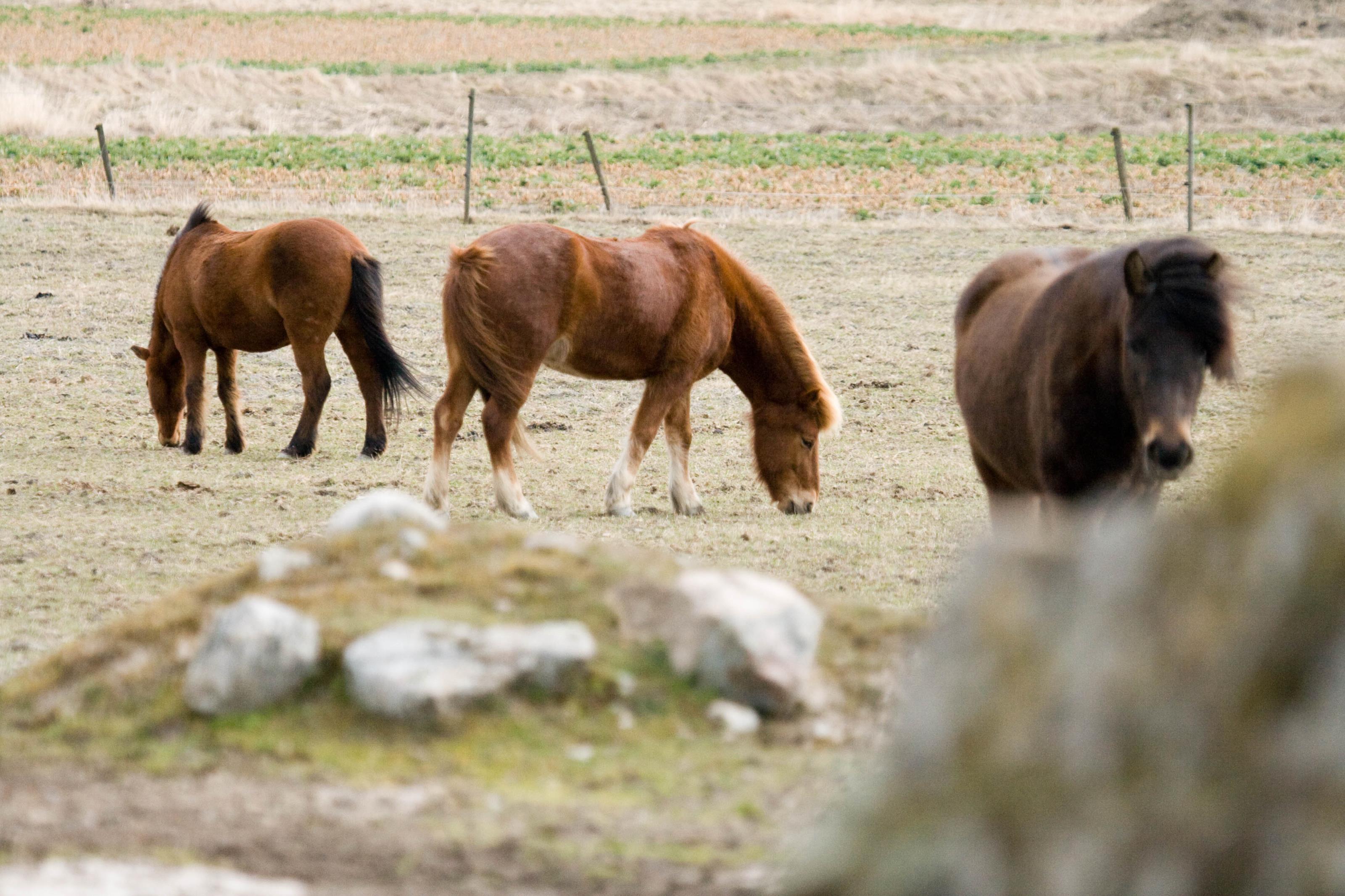 Islandshästar i kargt blåsigt landskap, nästan som på Island. På detta foto kan associeras till: häst, hästar, islandshäst, islandshästar, rida, stall, ridning, stallet, riskolan, ridskola, sto, märr, hov, hovar, hästdjur, riddjur.