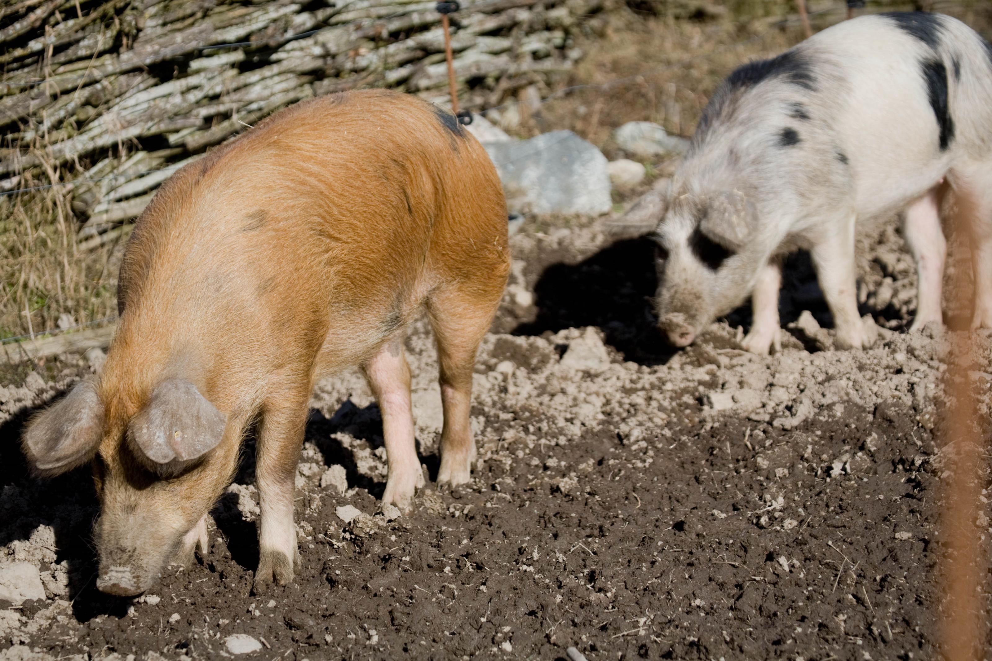 Två grisar som bökar i jorden. På detta foto kan associeras till: gris, grisar, djur, knorr, hovdjur, klövdjur, svin, so, sugga.
