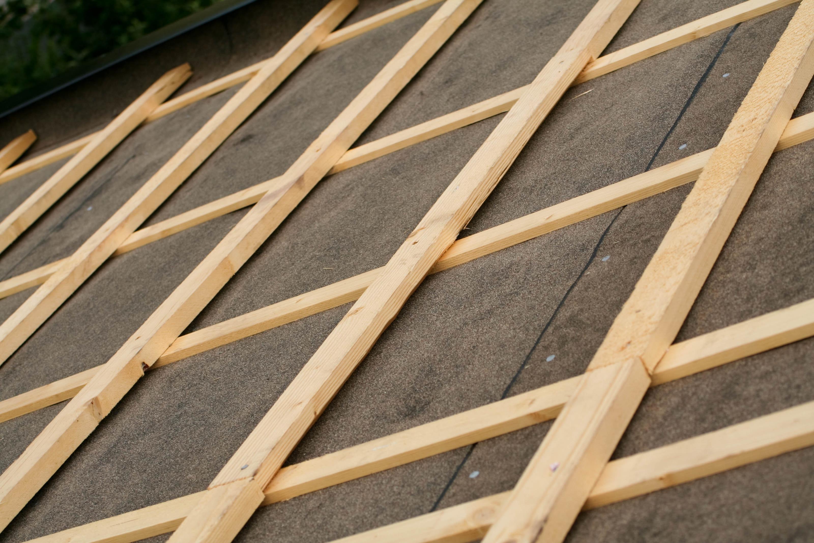 Takpapp och läkt på ett tak. På detta foto kan associeras till: tak, renovera, läkt, takpapp, taket, hustak, trä, papp.