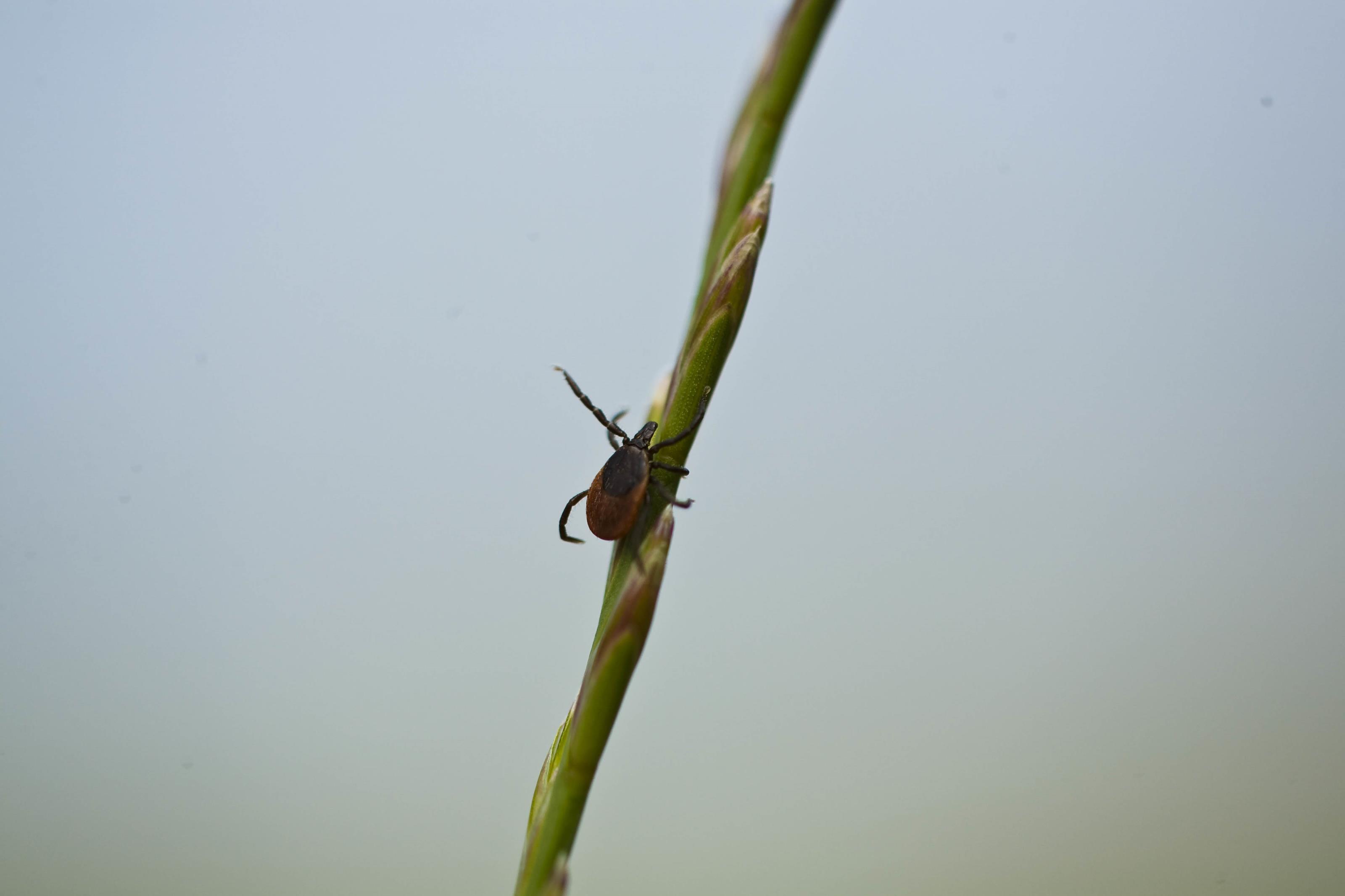 En fästing på ett grässtrå. Väntar på ett offer att suga blod från. På detta foto kan associeras till: fästing, fästingar, kvalster, tbc, borelia, fästingbett.