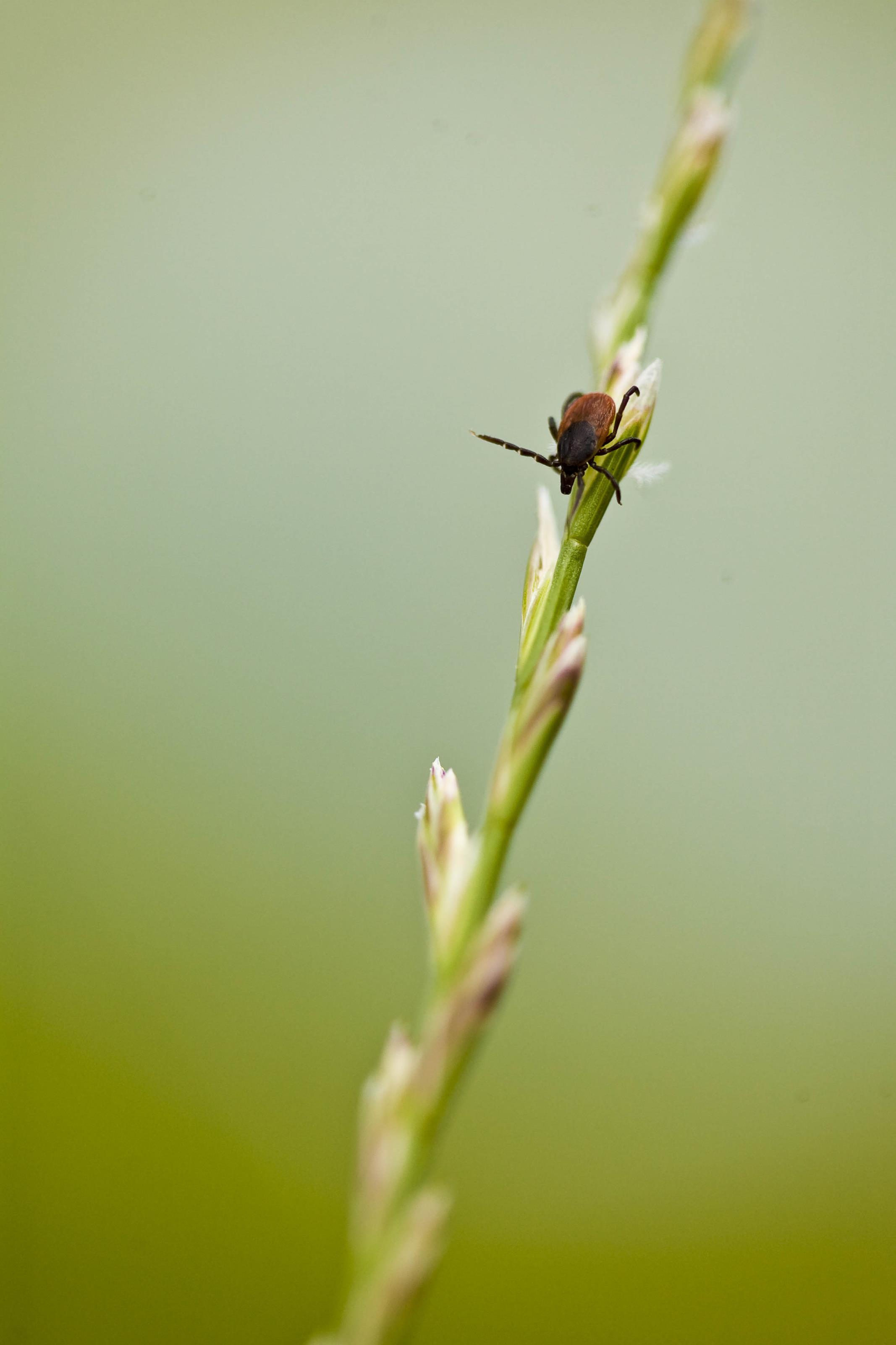 En fästing på ett grässtrå. Väntar på ett däggdjur eller människa att suga blod från. På detta foto kan associeras till: fästing, fästingar, kvalster, tbc, borelia, fästingbett.