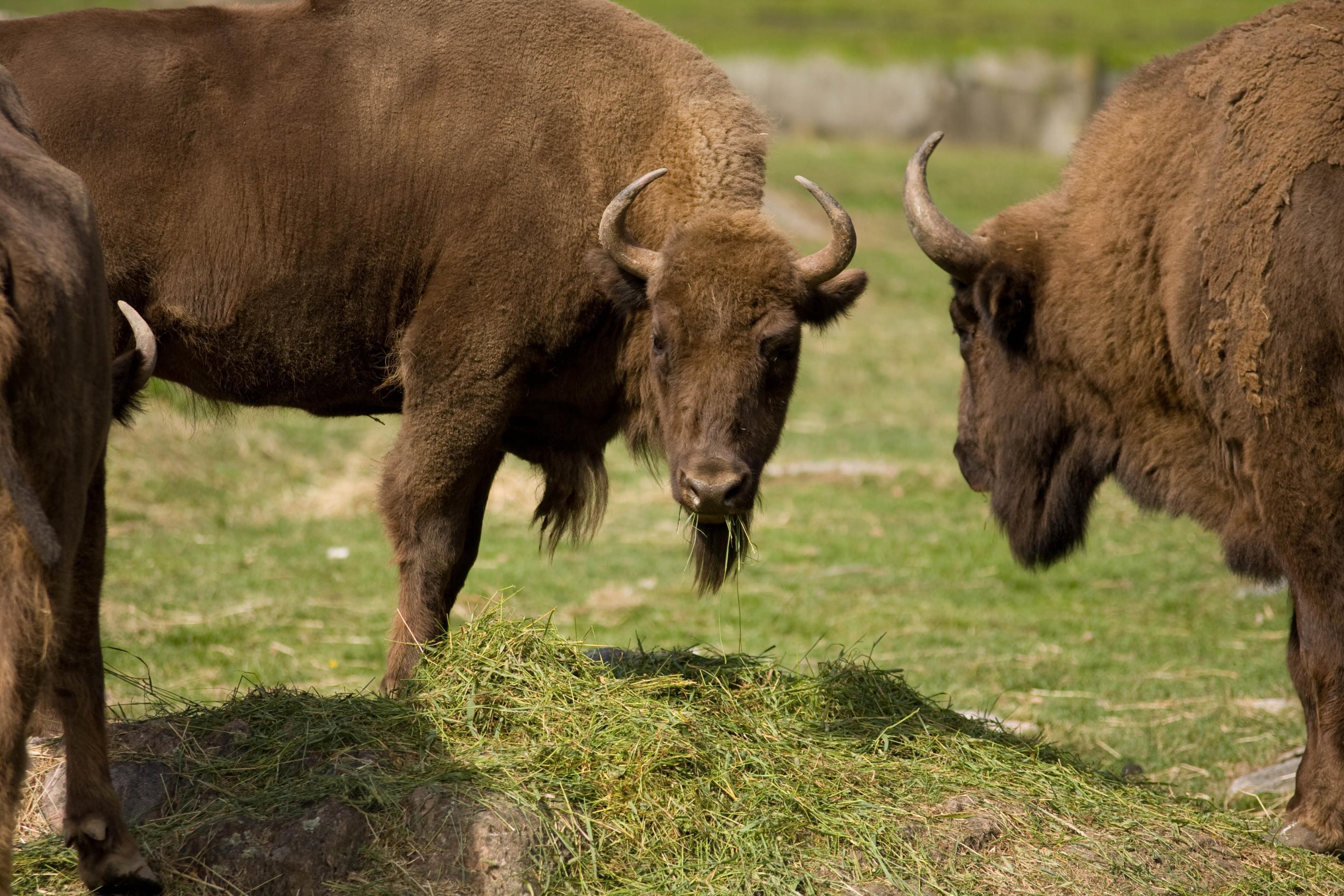 Några visenter eller europeisk bison som de också kallas. På detta foto kan associeras till: djurpark, djur, kolmården, visent, europeisk, bison.