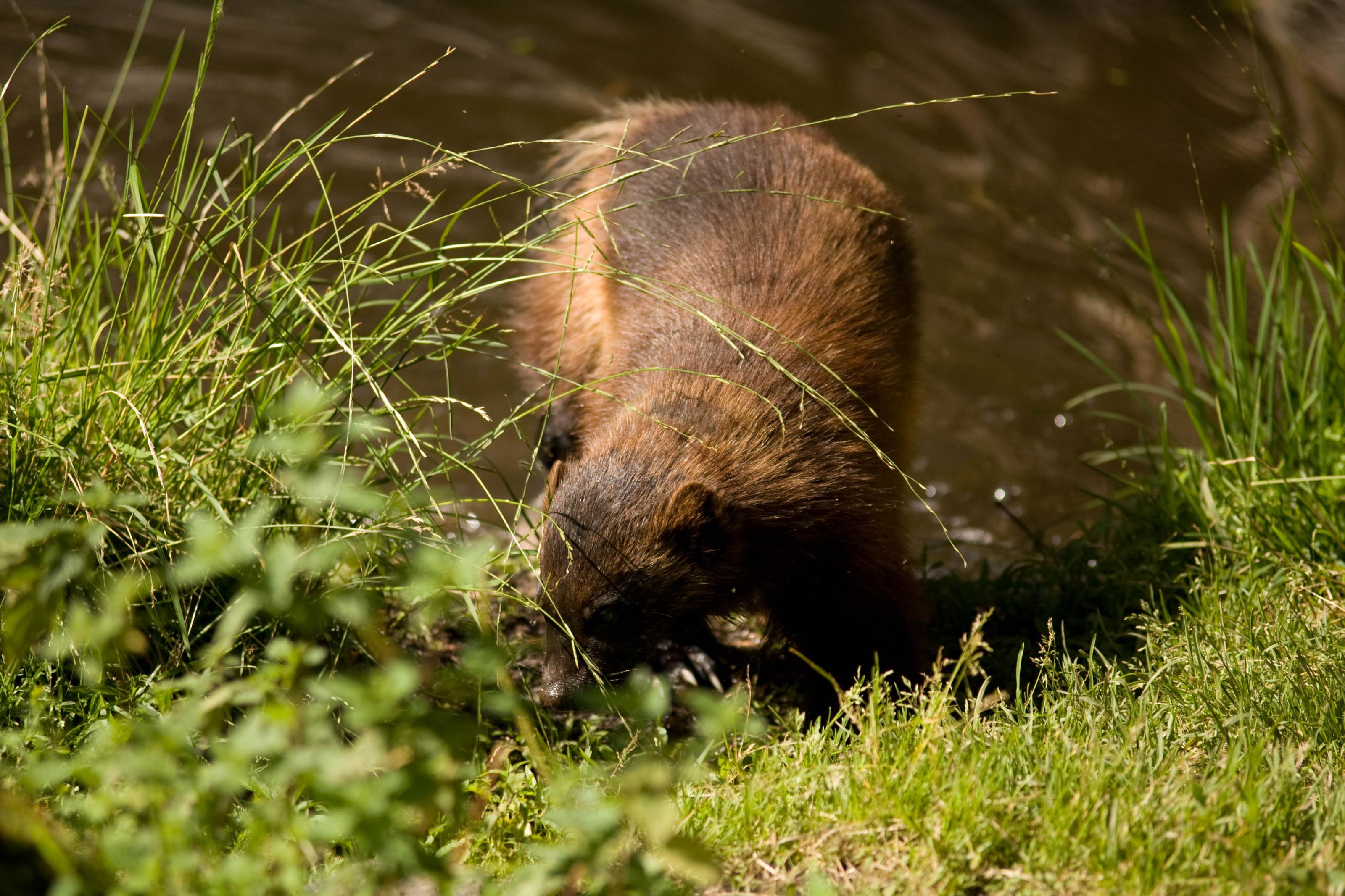 En järv bökar omkring i strandkanten. På detta foto kan associeras till: djurpark, djur, kolmården, järv, jäven, järvar, rovdjur, mårddjur.