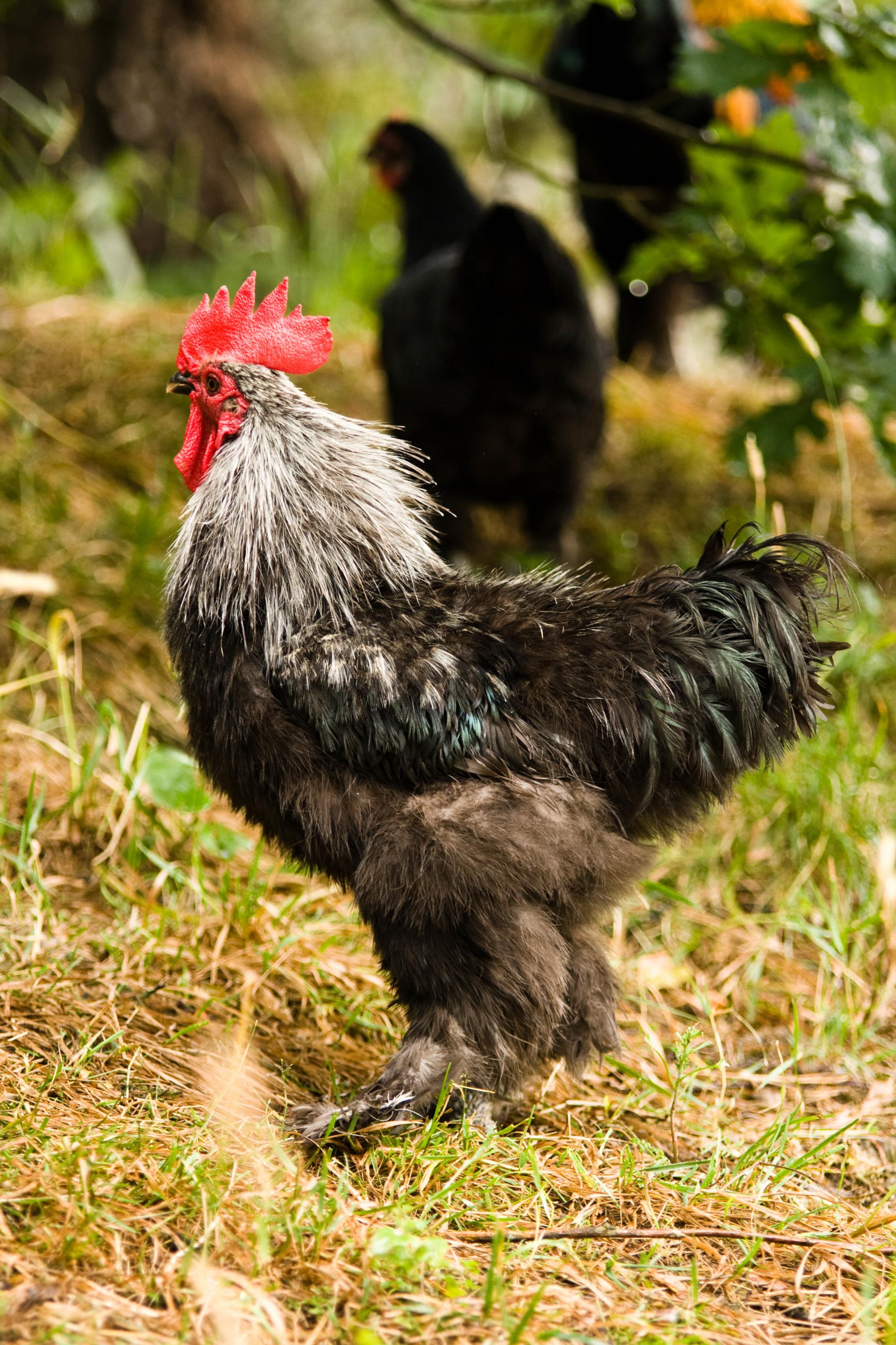 En tupp bland hönorna. På detta foto kan associeras till: djur, tupp, tuppar, tuppen, fågel.
