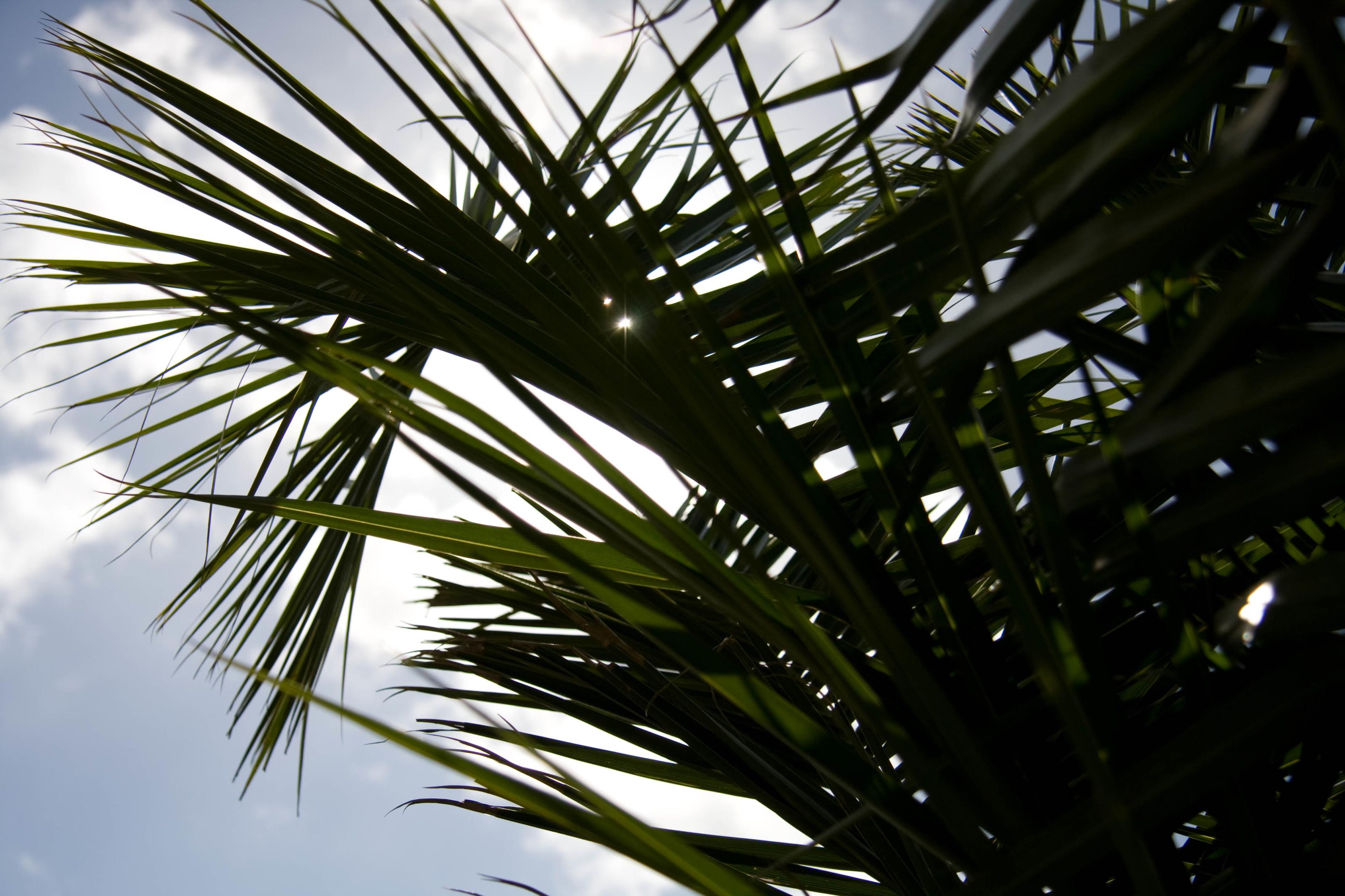 Palmblad i varmt klimat. På detta foto kan associeras till: blad, grön, gröna, himmel, moln, palm, palmblad, palmer, sol, soligt, varmt, växter, .
