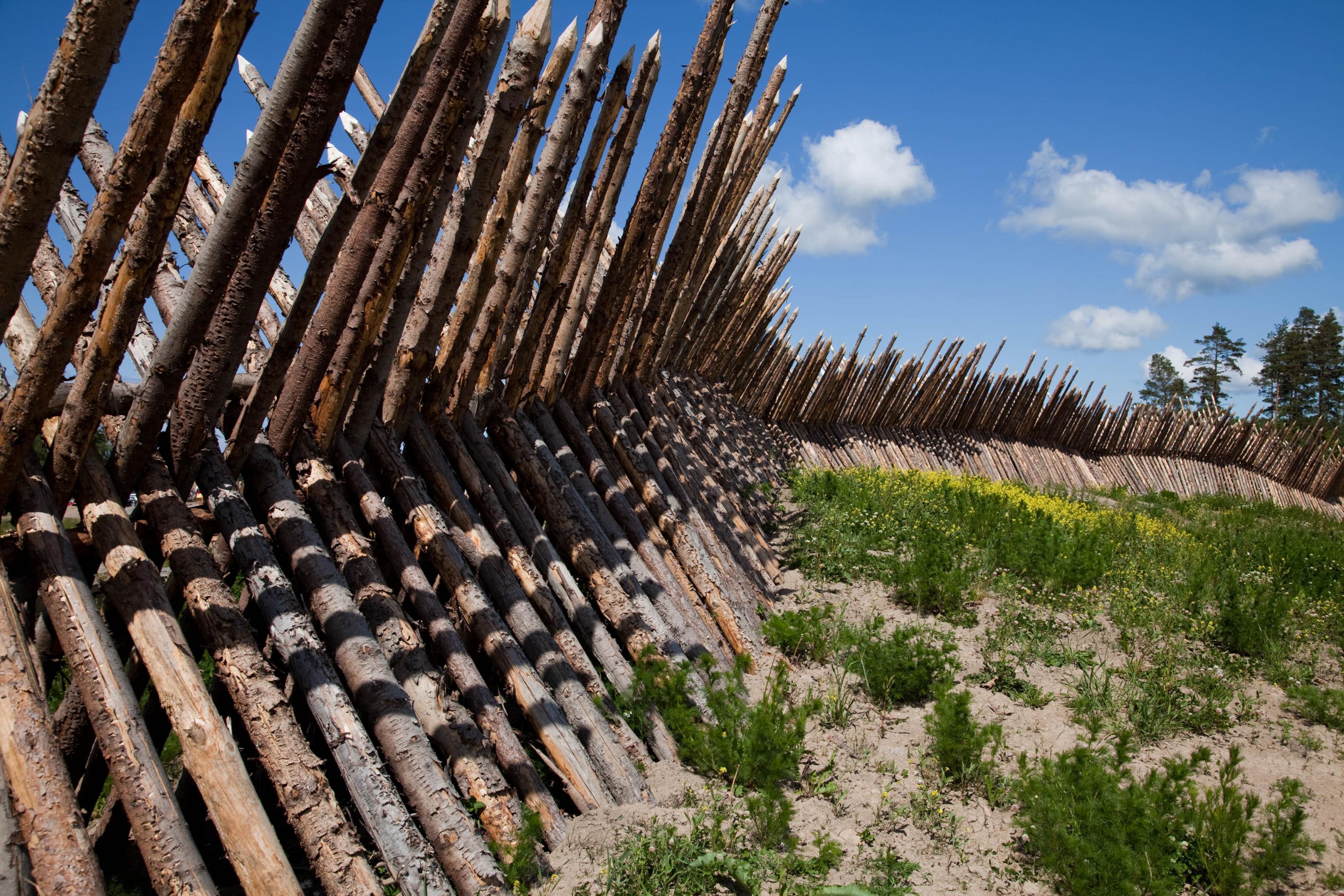 Palissad. Ett pålverk som fungerar som en befästning av korslagda stockar. Detta är en del av Medeltidens Värld i Götene. På detta foto kan associeras till: arn, arnäs, götene, jan, guillou, medeltidens, värld, riddare, tempelriddaren, .