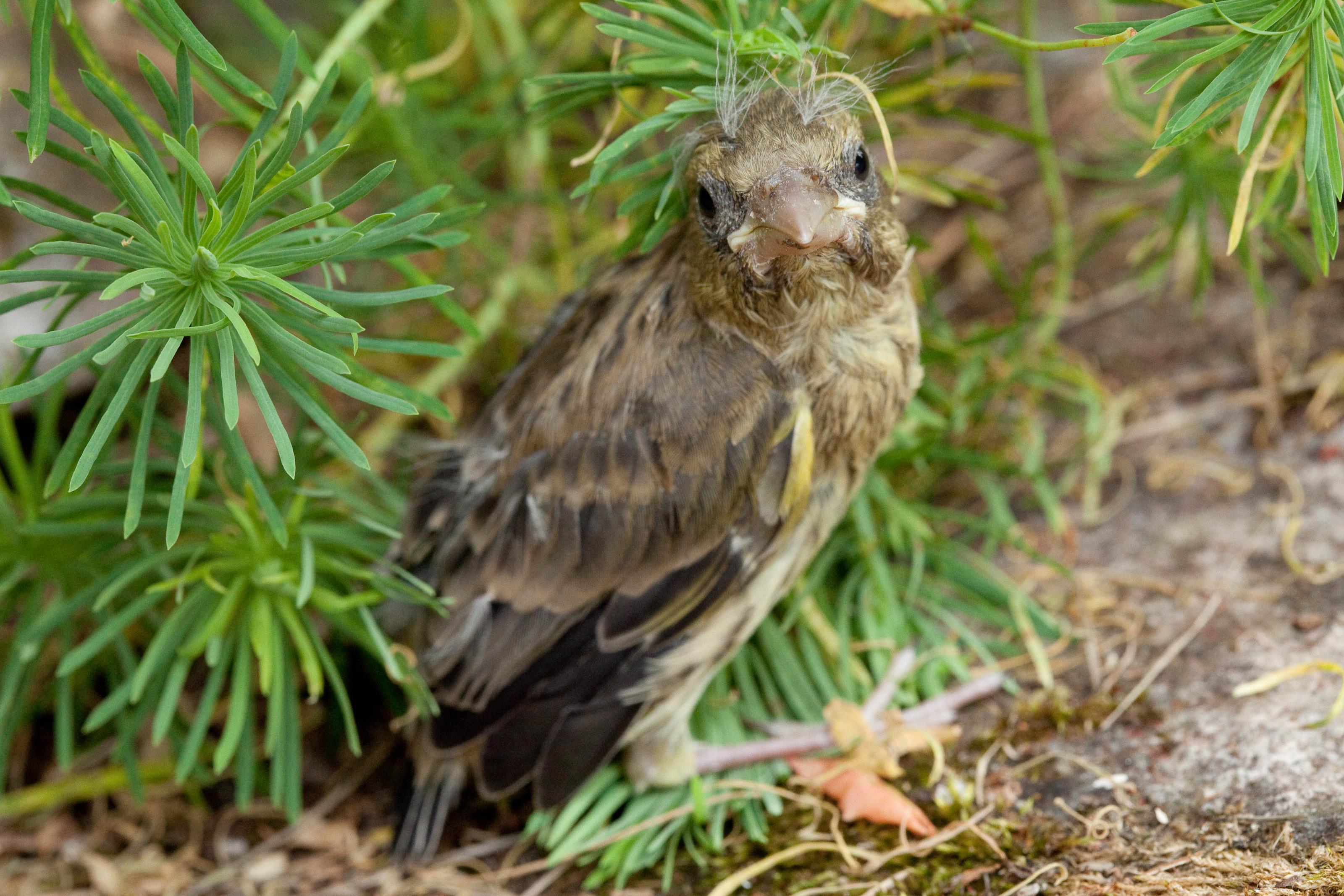 En fågelunge. En grönfink som är några veckor gammal och precis har lämnat boet. På detta foto kan associeras till: fågel, fågelungar, fågelunge, grönfink, .