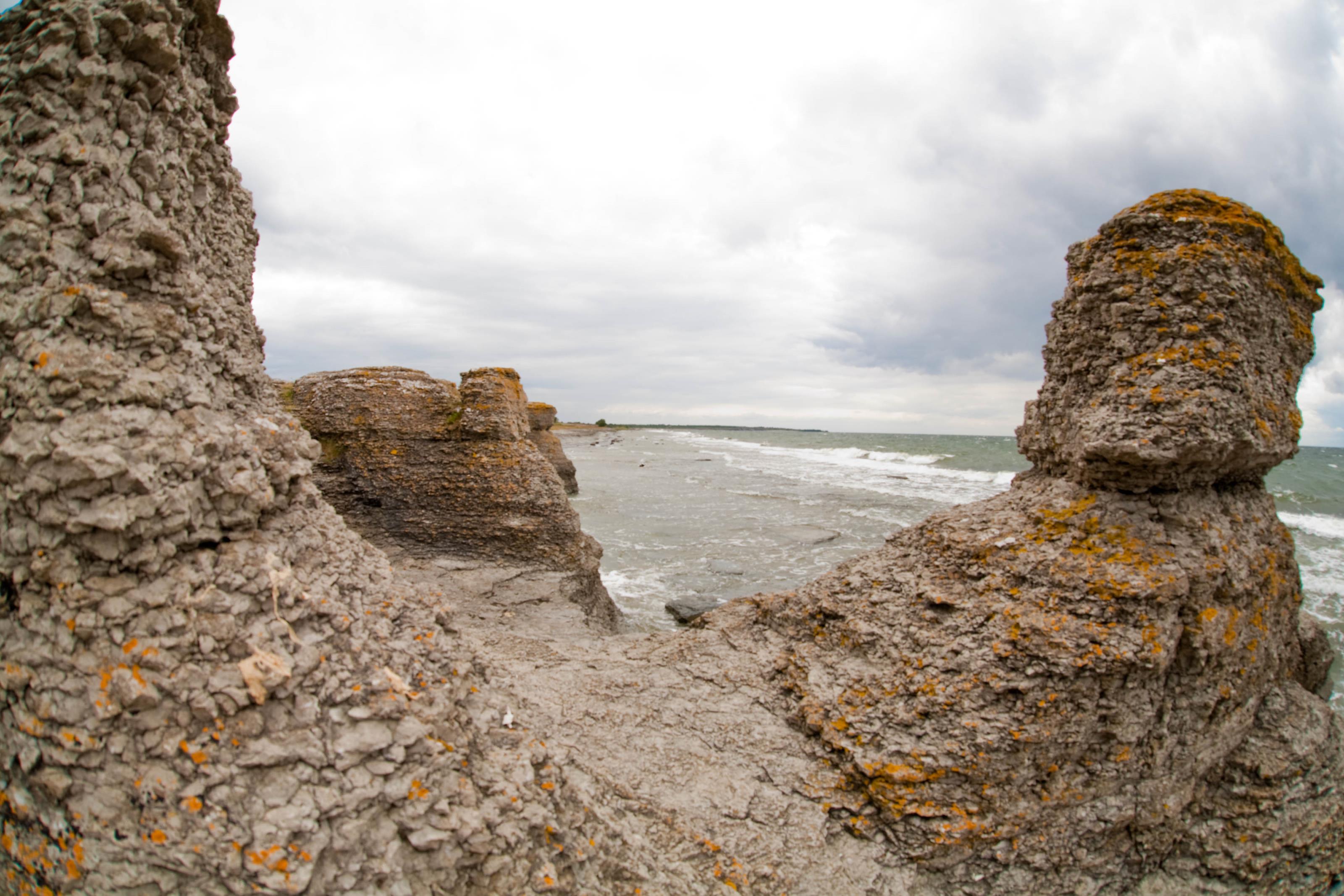 Vy från Byrums raukar, Ölands enda riktiga raukar. På detta foto kan associeras till: berg, byrum, byrums, raukar, hav, havet, raukar, vatten, öland, .