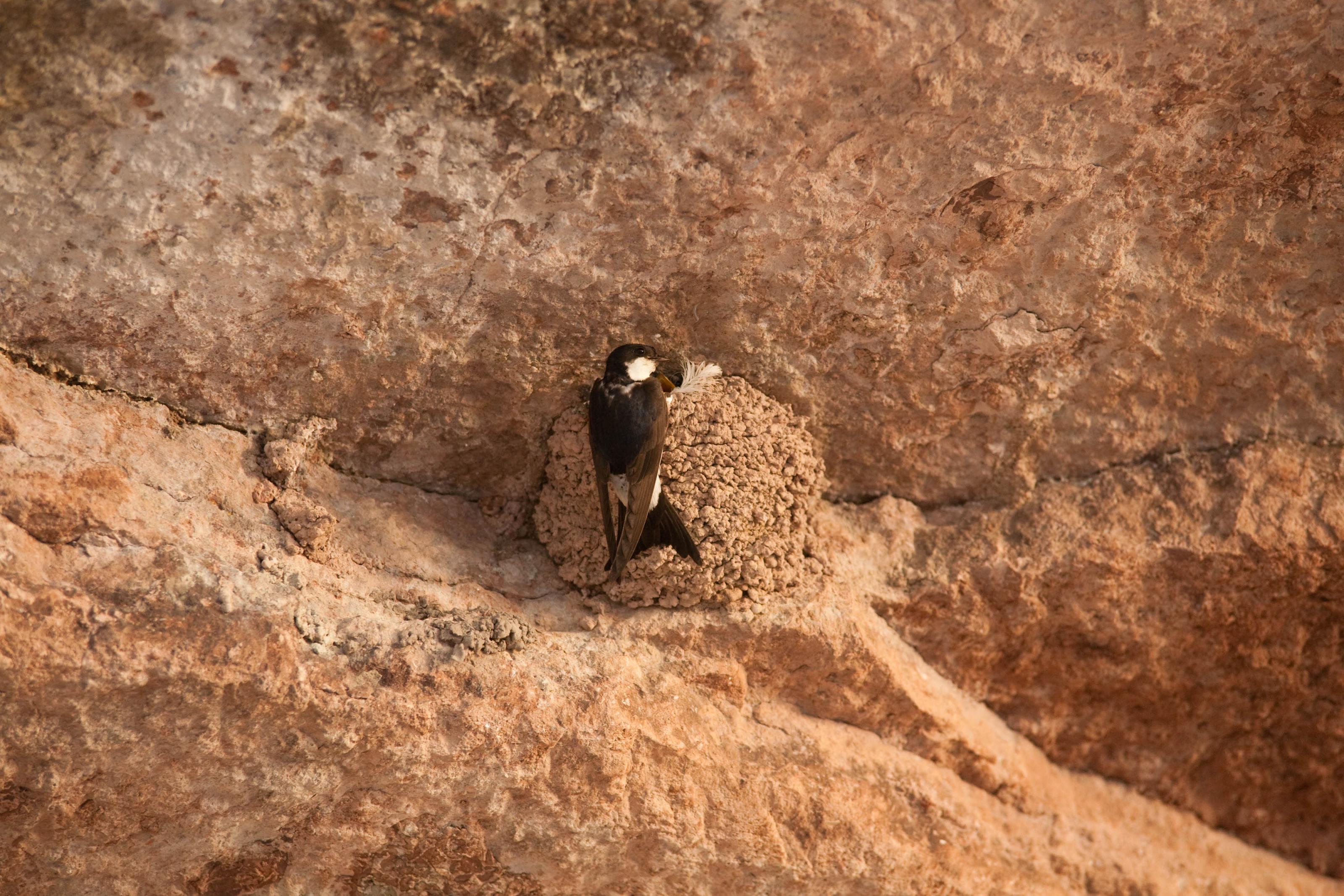 En svala vid sitt svalbo, matar sina fågelungar. På detta foto kan associeras till: fågel, fåglar, svala, svalbo, svalor, öland, .