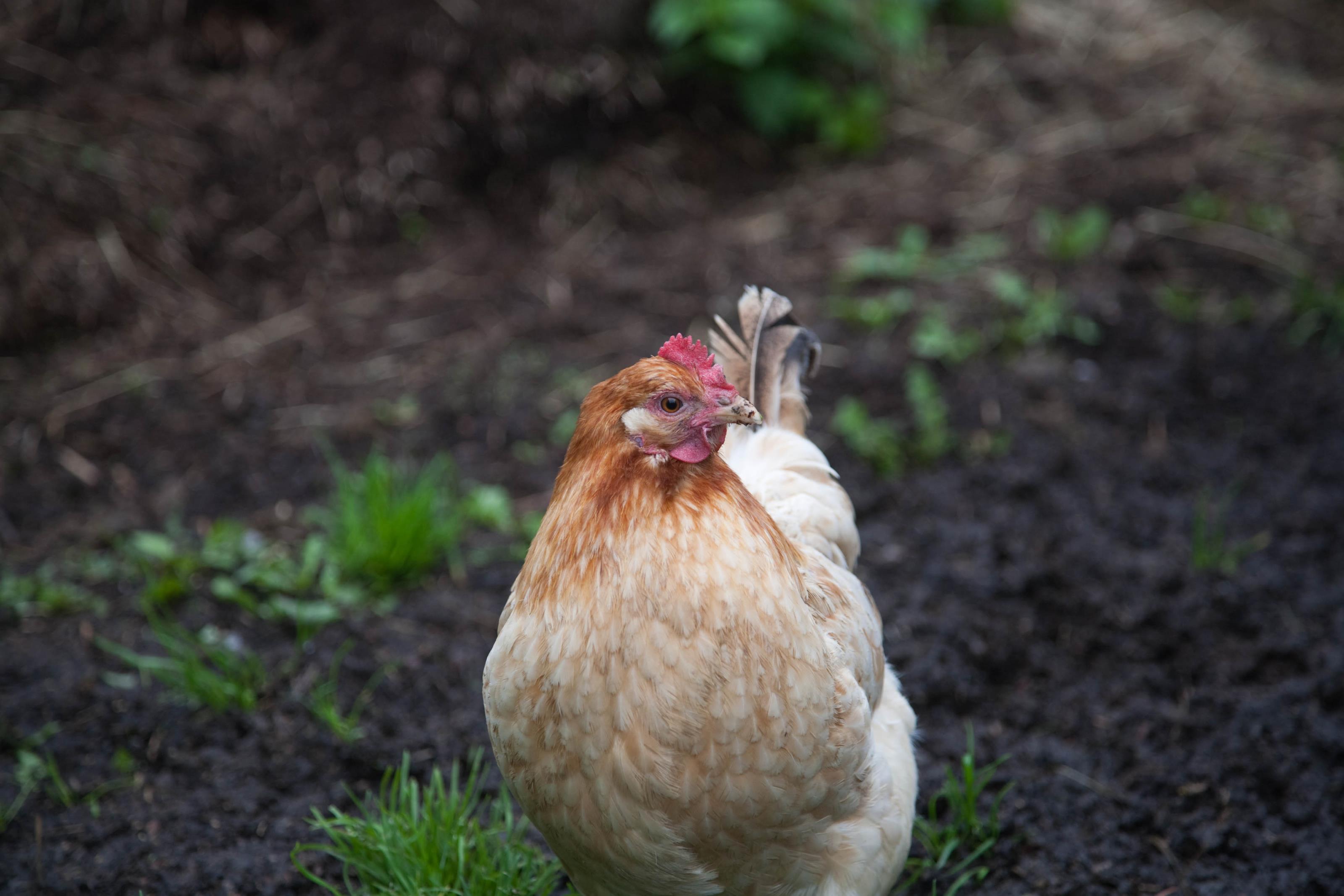 En höna går och pickar på gården. På detta foto kan associeras till: fågel, fåglar, höna, höns, hönsfåglar, tamfåglar, .