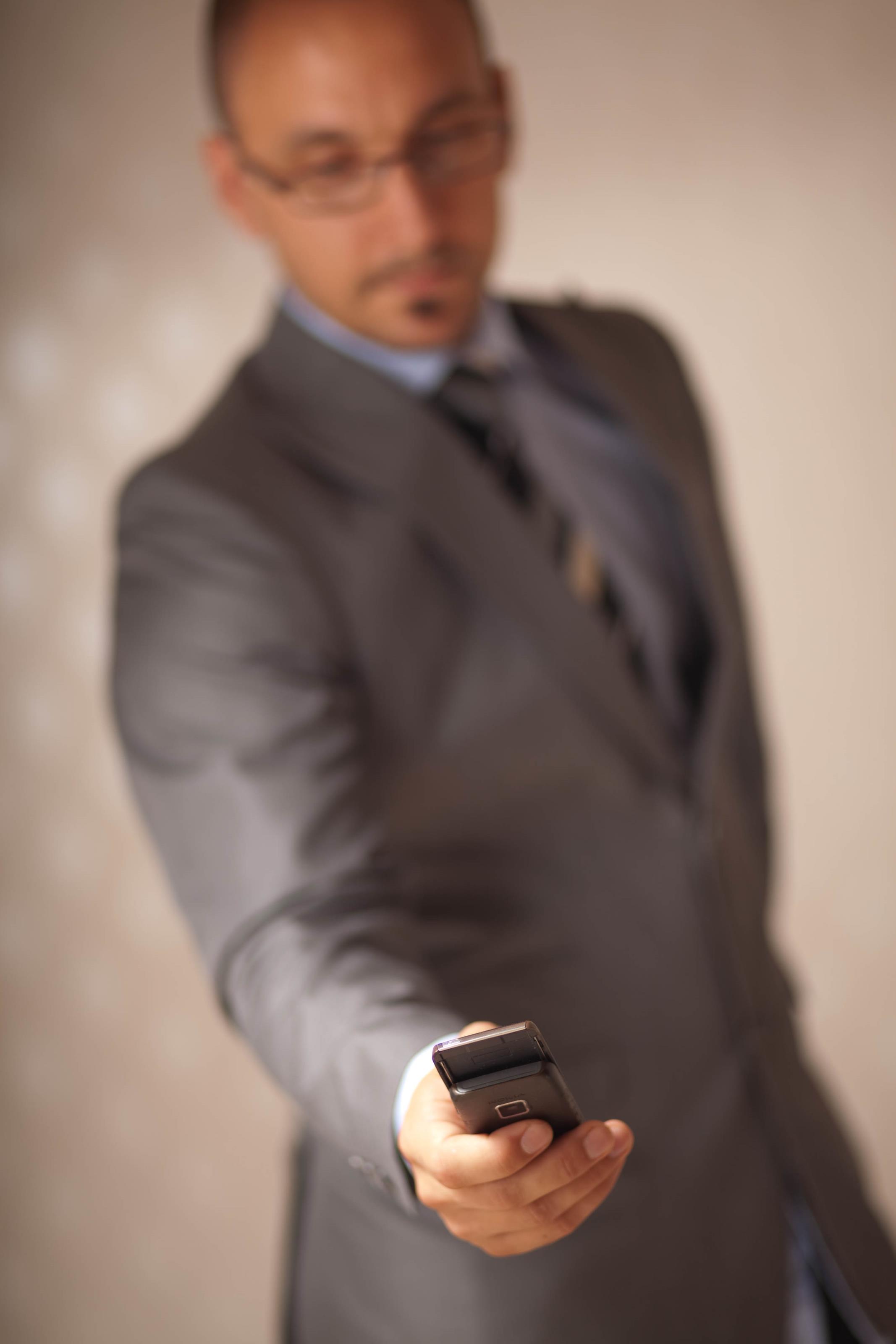 En man använder en mobiltelefon. På detta foto kan associeras till: affärsman, arbetare, business, businessman, chef, företagare, kostym, man, mobil, mobiltelefon, samtal, sms, säljare, telefon, vd, .