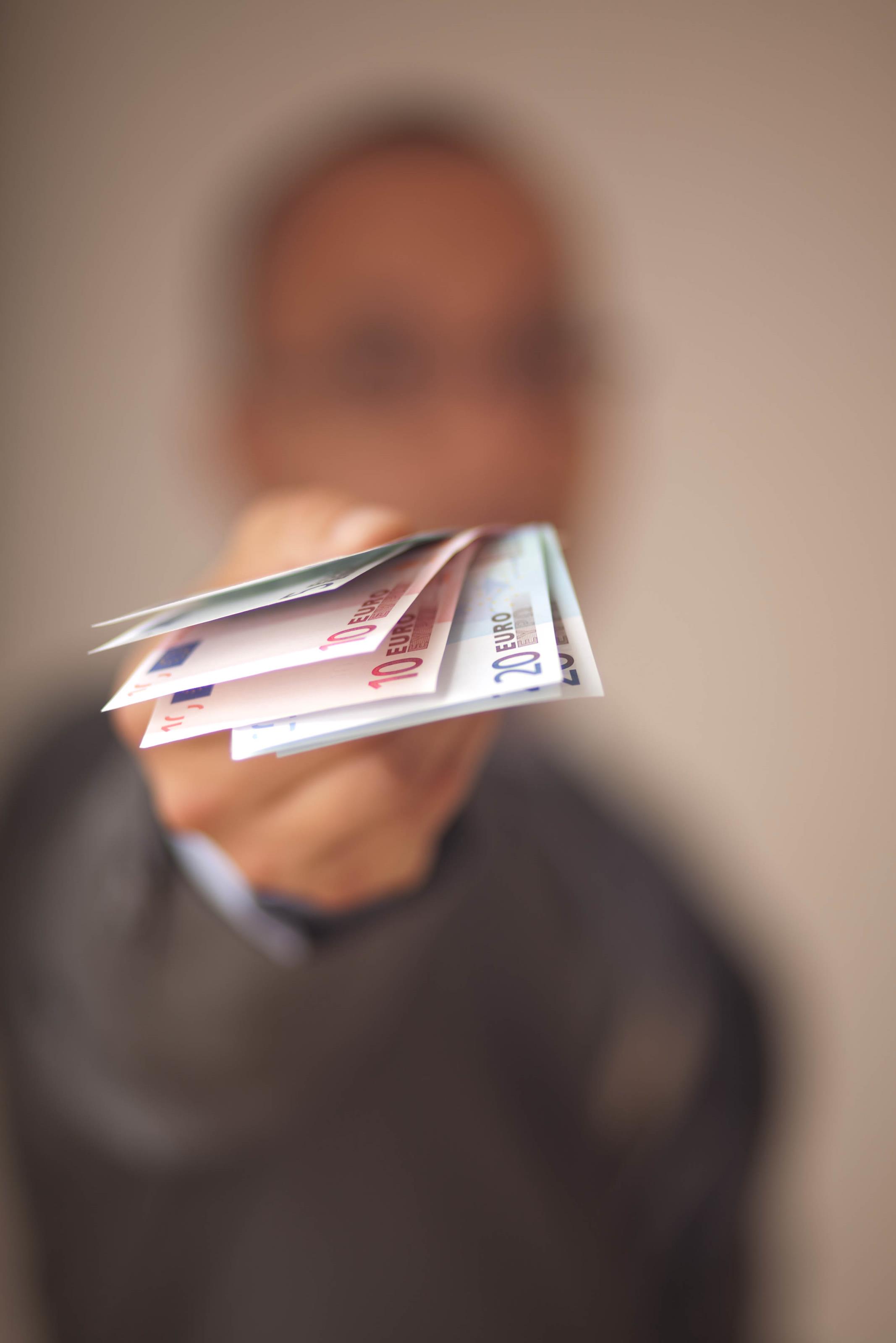 En man hanterar en summa pengar. På detta foto kan associeras till: affärsman, arbetare, business, businessman, chef, euro, företagare, kostym, man, pengar, säljare, vd, .
