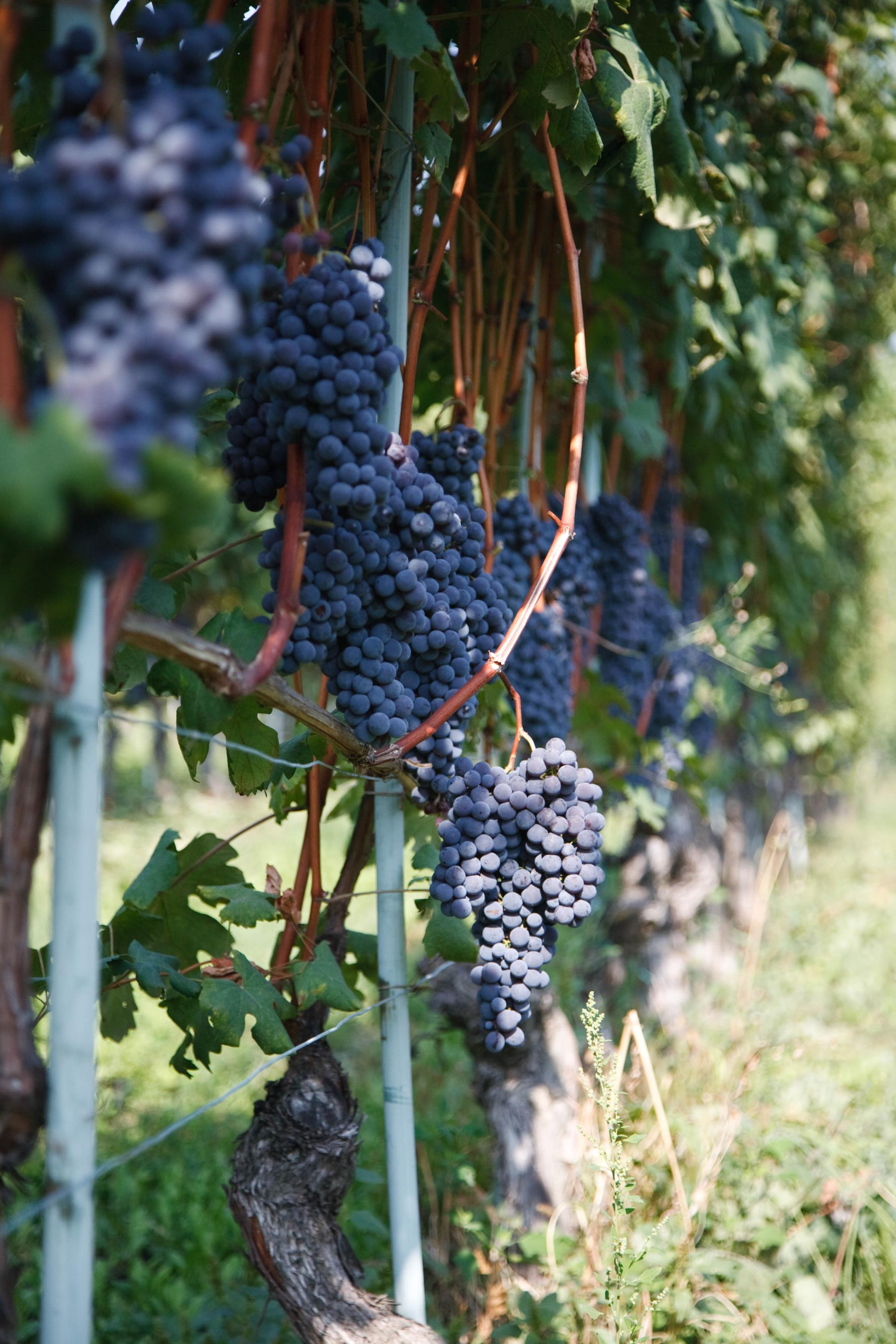 Vindruvor i klasar hänger på vinrankorna på en vinfält. På detta foto kan associeras till: blå, blåa, druvor, frukt, italien, vin, vindruvor, vingård, vinodlingar, vinrankor, .