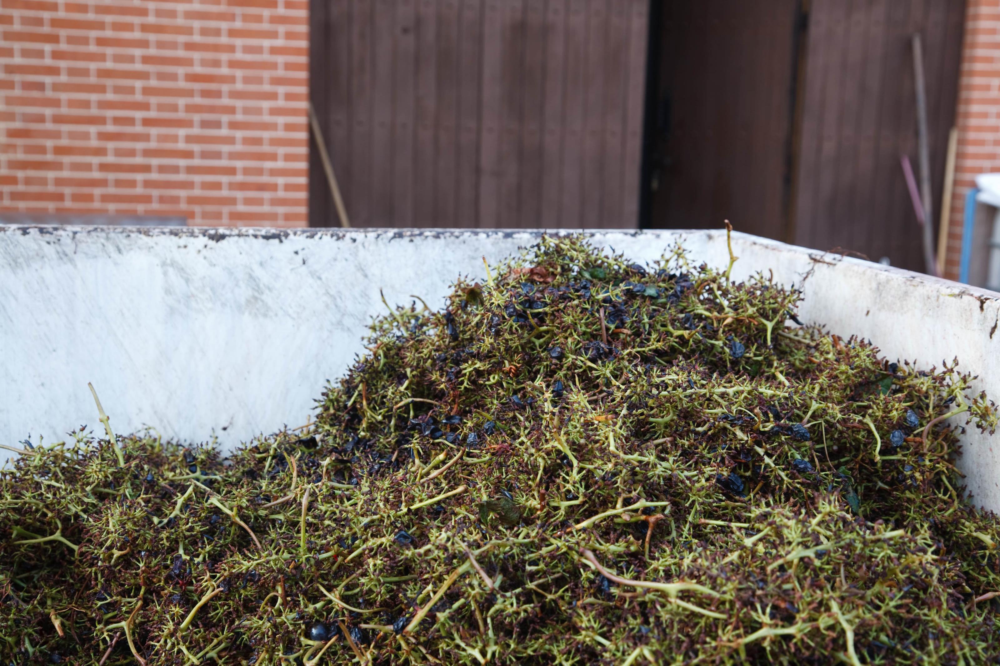 Rester vid vintillverkning. Alla druvor är av plockade. På detta foto kan associeras till: frukt, italien, rensa, stam, vindruvor, vintillverkning, .