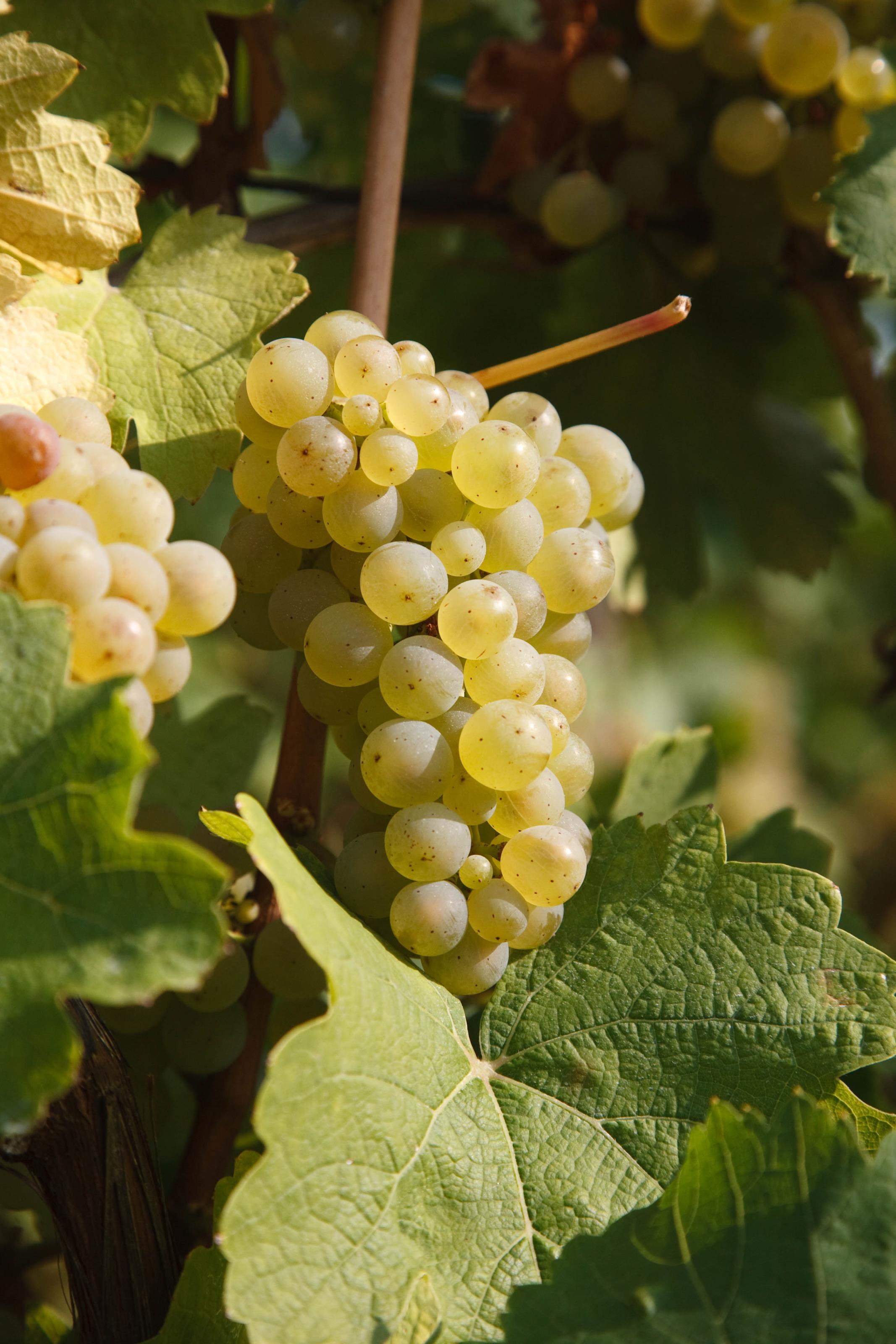 Klasas med mogna gröna vindruvor händer från vinstocken. Mitt i en stor vinodling.Sökord: druvorfruktgrönadruvorvinvindruvorvingårdvinodlingvinodlingarvinrankor Storleken på denna bild är 2134 x 3200 pixlar. Denna bild har mycket hög upplösning. Detta ger en bild på 18 x 27 cm med 300 dpi. Bildens id är 6836, anges vid beställning.