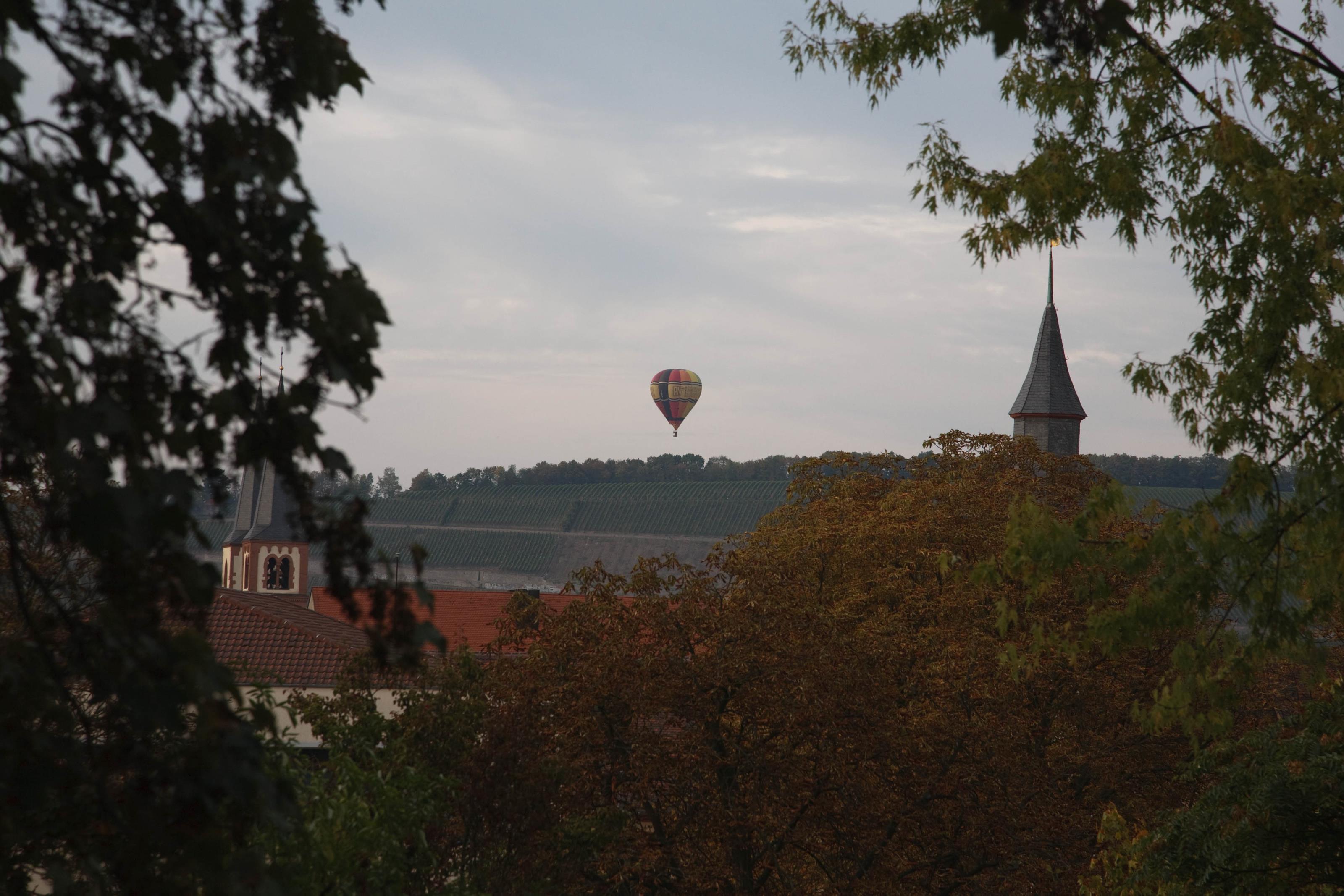 Luftballong flyger över en stad. På detta foto kan associeras till: tyskland, würzburg, .