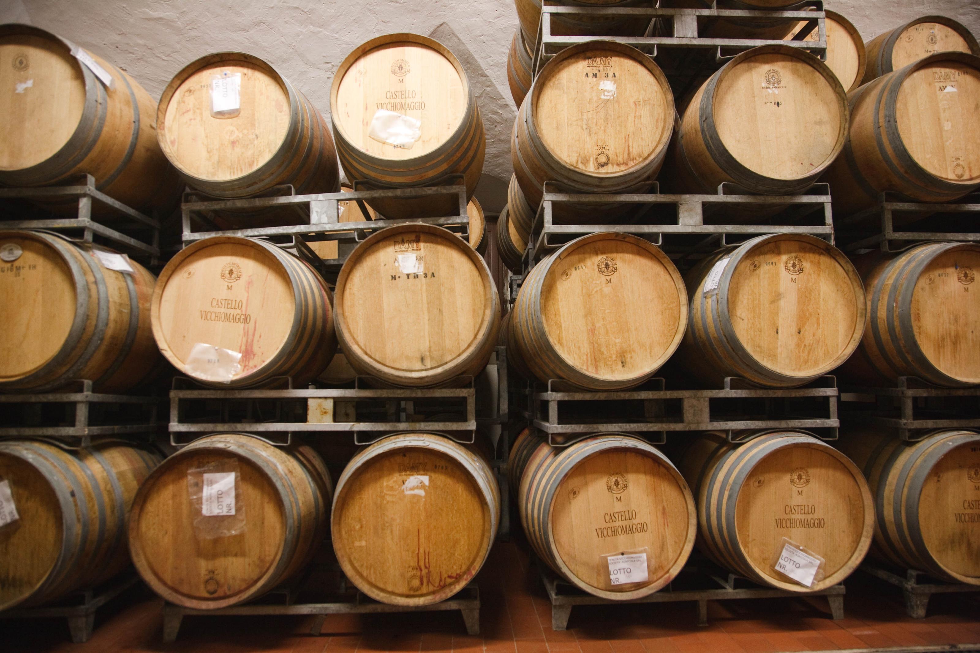 Tunnor för vin, whiskey eller annan dryckestillverkning. På detta foto kan associeras till: chianti, italien, lagra, lagring, tunna, tunnor, vin, vingård, vinkällare, vintunna, vintunnor, whiskey, whisky, .