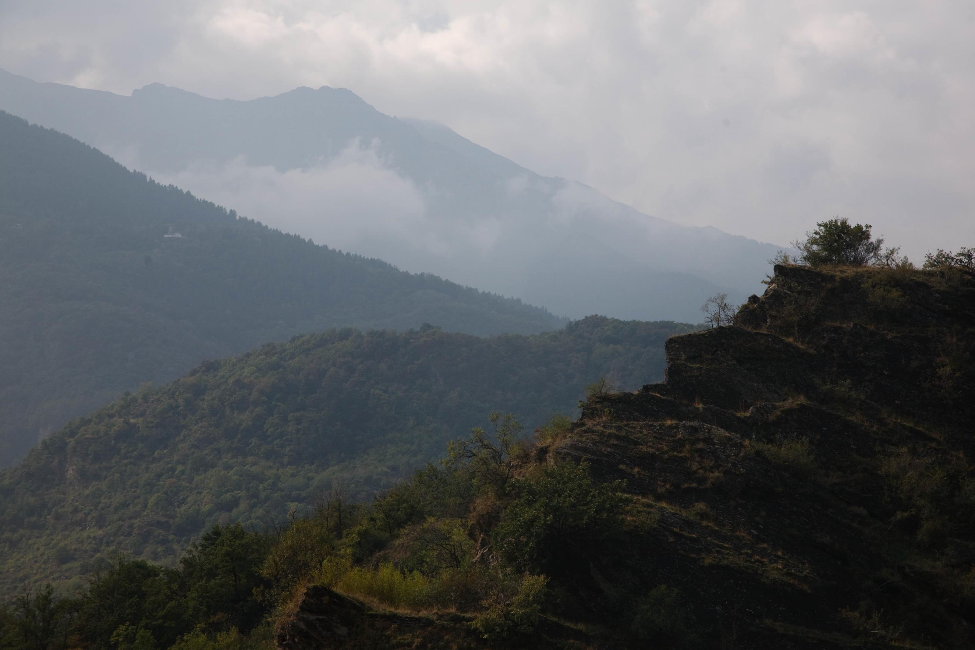 Dimmi bland bergen i Alperna. På detta foto kan associeras till: alperna, berg, dimma, dis, disigt, italien, .