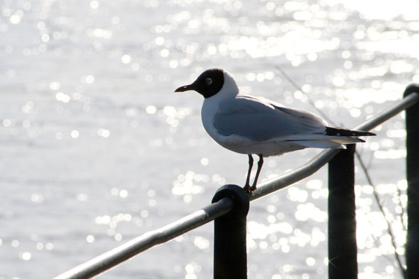 En skrattmås i motljus med glitter i vattnet. På detta foto kan associeras till: seagull, skrattmås, räcke, staket, vatten, water, fence, mås.
