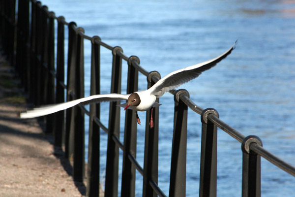 En flygande skrattmås. På detta foto kan associeras till: seagull, skrattmås, staket, fence, väg, road, path, stig, vatten, water, mås.