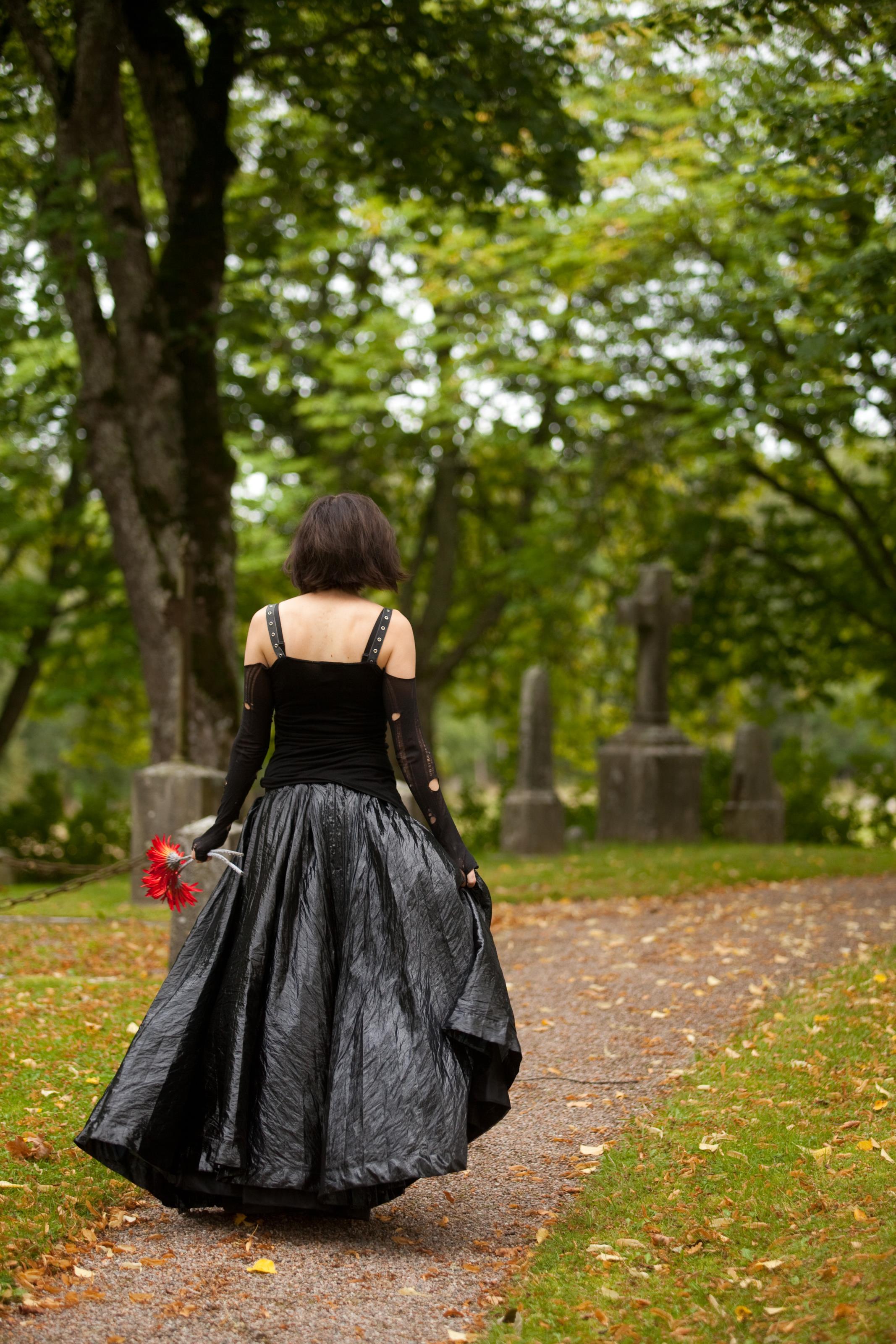 En svartklädd kvinna på en begravningsplats. På detta foto kan associeras till: Begravning, bregravningsplats, flicka, grav, gravar, gå, går, klänning, kvinna, kyrkogård, människa, människor, röd, sorg, svart, tjej, .