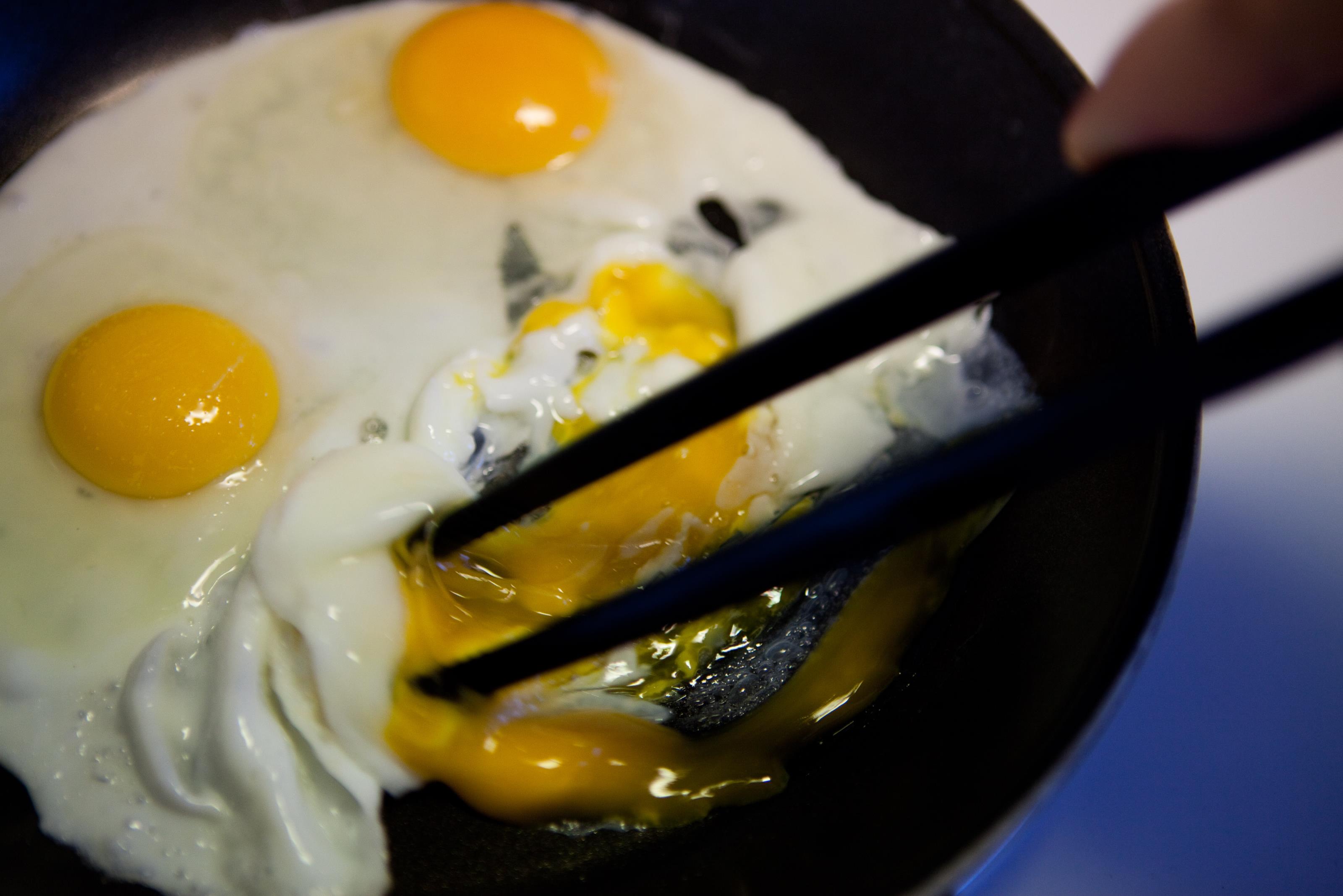 Steker äggröra i en stekpanna. På detta foto kan associeras till: frukost, kök, laga, mat, steka, stekpanna, tre, ägg, äggröra, äggula, äggulor, äggvita, .