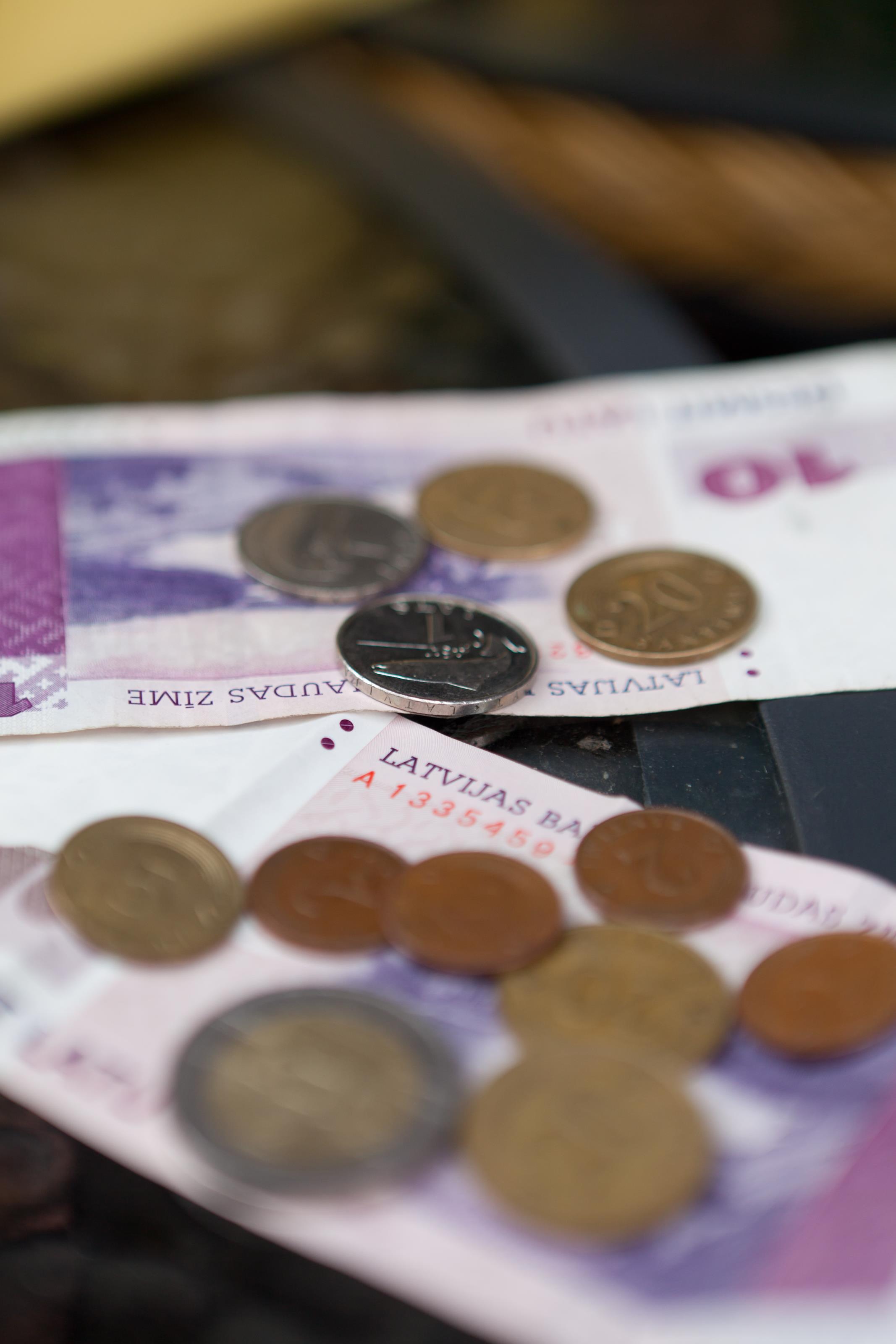 Lettiska valutan Lats. Både sedlar och mynt. På detta foto kan associeras till: betala, betalar, gamla, stan, kontant, kontanter, lats, lettiska, lettland, lvl, pengar, riga, sedlar, valuta, .
