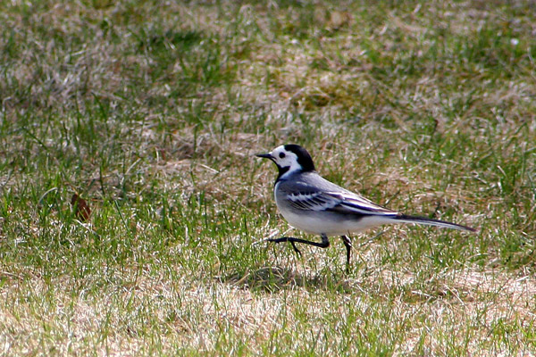 En sädesärla som är ute och går. På detta foto kan associeras till: fågel, gå, promenad, gräs, greäsmatta, sädesärla.