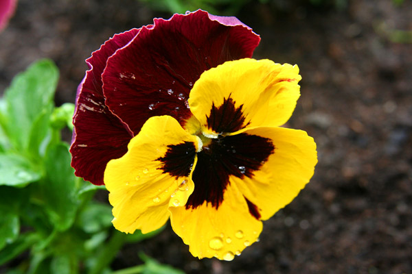 Blomma i rabatt på våren. På detta foto kan associeras till: blomma, rabatt, jord, årstid, växt, pensee, penseer, gul, svart, röd, vinröd.