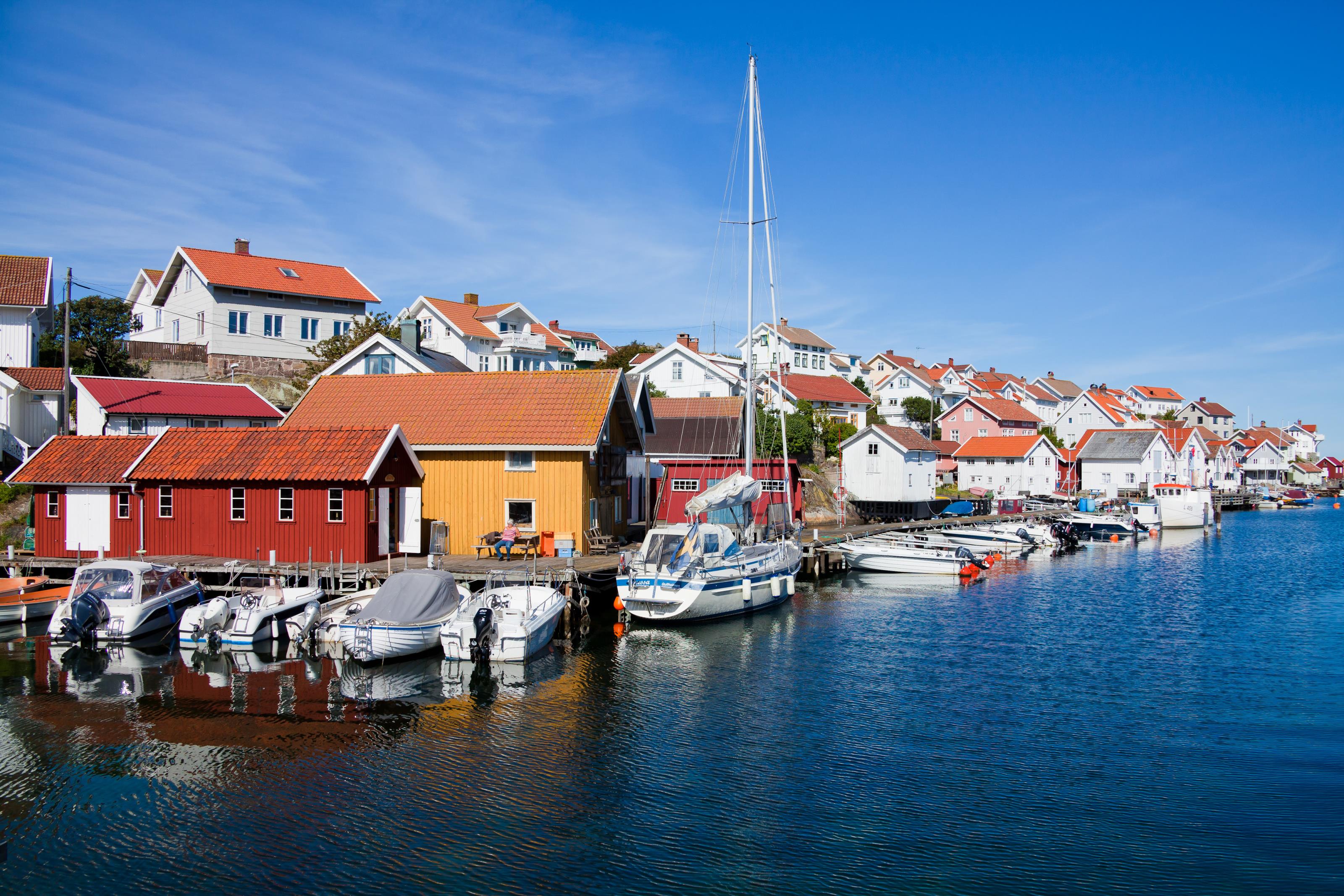 Vy över hamn vid Gullholmen på svenska västkusten. På detta foto kan associeras till: bohuslän, byggnad, byggnader, båt, båtar, gullholmen, hamn, hav, havet, hus, härmanö, kust, kusten, mast, segelbåt, segelbåtar, sjöbod, sjöbodar, sjönära, soligt, sommar, vatten, västkust, västkusten, .
